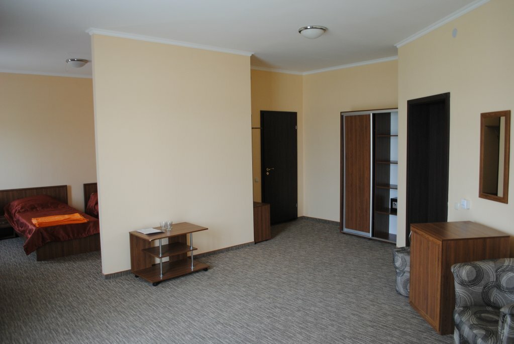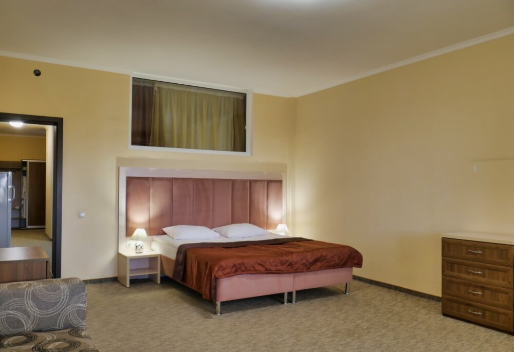 Однокомнатный стандарт. В этом просторном номере есть все необходимое для комфортного отдыха. Номер разделен перегородкой на спальную зону и зону отдыха, где расположен раскладной диван. В таком номере можно расположиться как вдвоем, так и семейн...