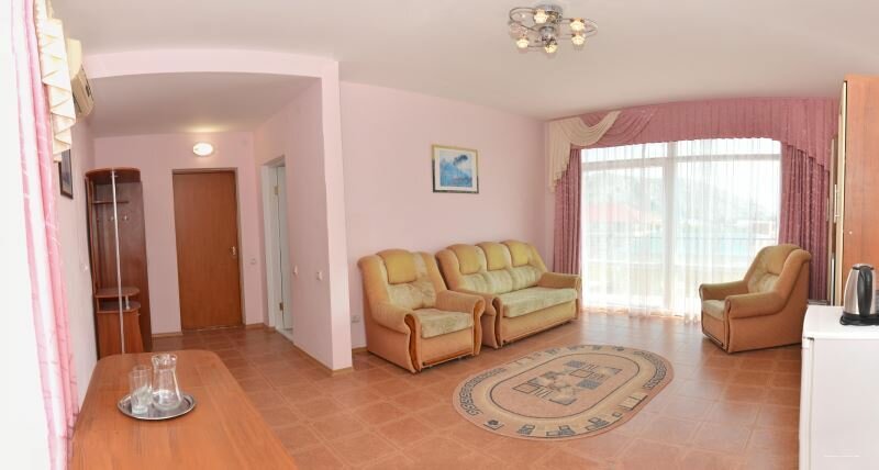 Отдыхали в этом отеле в августе 2020 года, номер стандарт с балконом. Плюсы — большой просторный номер с телевизором, кондиционером, холодильником, необходимым набором мебели, санузел с просторной душевой кабиной, хороший балкон с мебелью, уборка в номере ежедневно, отзывчивый персонал, вкусное и недорогое кафе на территории, небольшой уютный внутренний двор с бассейном. В отеле тихо и спокойно. Из минусов — в номере не было чайника, приходилось пользоваться чайником, находящимся в кафе, шторы в номере слишком прозрачные — с утра будило яркое солнце, бассейн хороший, но, к сожалению, неподогреваемый. Нет детской площадки. По поводу расположения — район аквапарка около мыса Алчак, виды из окна потрясающие. До моря идти минут 15-20, но дорога ровная, без спусков-подъемов, место понравилось.