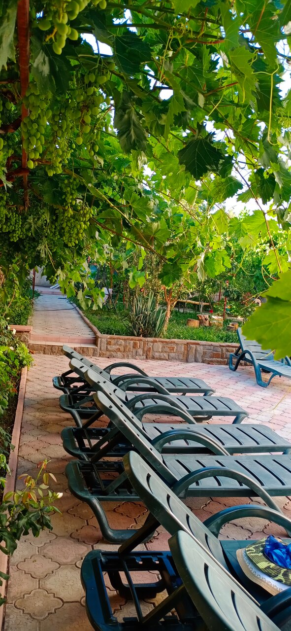 Просто словами описать сложно. Живём в двухкомнатном номере, очень уютно, 2 балкона, номер большой, есть всё. Двор вообще отдельная тема, бассейн во дворе расположен так, что тень есть в любое время суток. Сколько тут винограда, у нас за неделю уже аскомина, разрешают есть любым количеством, много инжира, уже наелись на год вперёд. Персонал на твёрдую 5, все вежливо, приветливо, раскажут помогут, накормят.. Ах да, кухня!!! Я счаслив, что жена не стоит у печки, завтрак, обед, ужин — цены ниже чем в столовке, ну и конечно же пирожки ВЫСШИЙ КЛАСС. Если хотите приехать в Судак — Вам сюда.