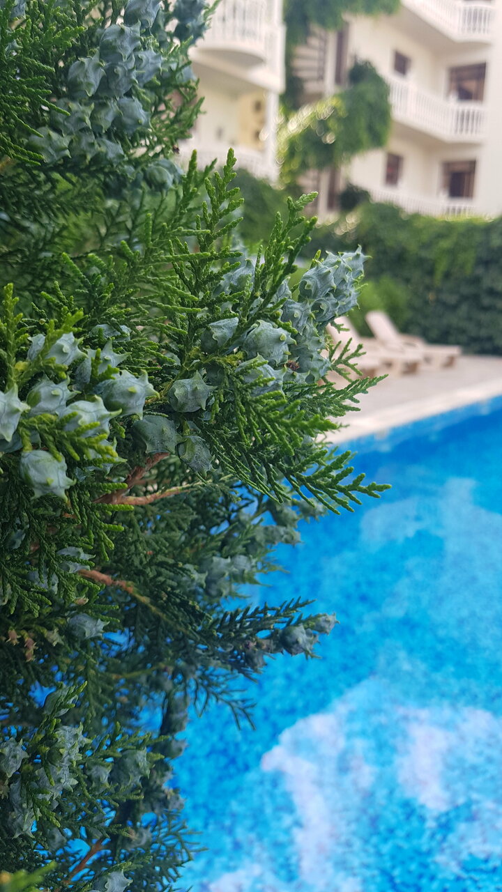 Максимум заботы о гостях, может даже немного гиперопеки) Но мы остались довольны, так как приехав в самую жару под сорок градусов, получили все что необходимо. Прохладный бассейн не пахнущий хлоркой, много зелени+зонты, поэтому всегда есть тенек. Кондиционер и холодильник в номере, кулеры с водой, холодильник с напитками, которые можно купить, никуда не выходя. Позавтракать и поужинать(шведский стол), и что-то заказать на обед можно тут же. Учитывая ‘южный сервис’ местных общепитов, возможность не ждать, а за вполне умеренную цену получить еду на месте так сказать, почти бесценно. И уже после, отправиться купаться на море на закате. Выпить кофе приготовленный в турке на песке, как отличное завершение дня. Для детей есть место для игр и аниматоры, что тоже большой плюс. Ну и отдельно, отмечу, местных питомцев, видовую крышу, а так же присутствие мест для курения. Так же есть своя стоянка для авто в двух-трёх минутах ходьбы.