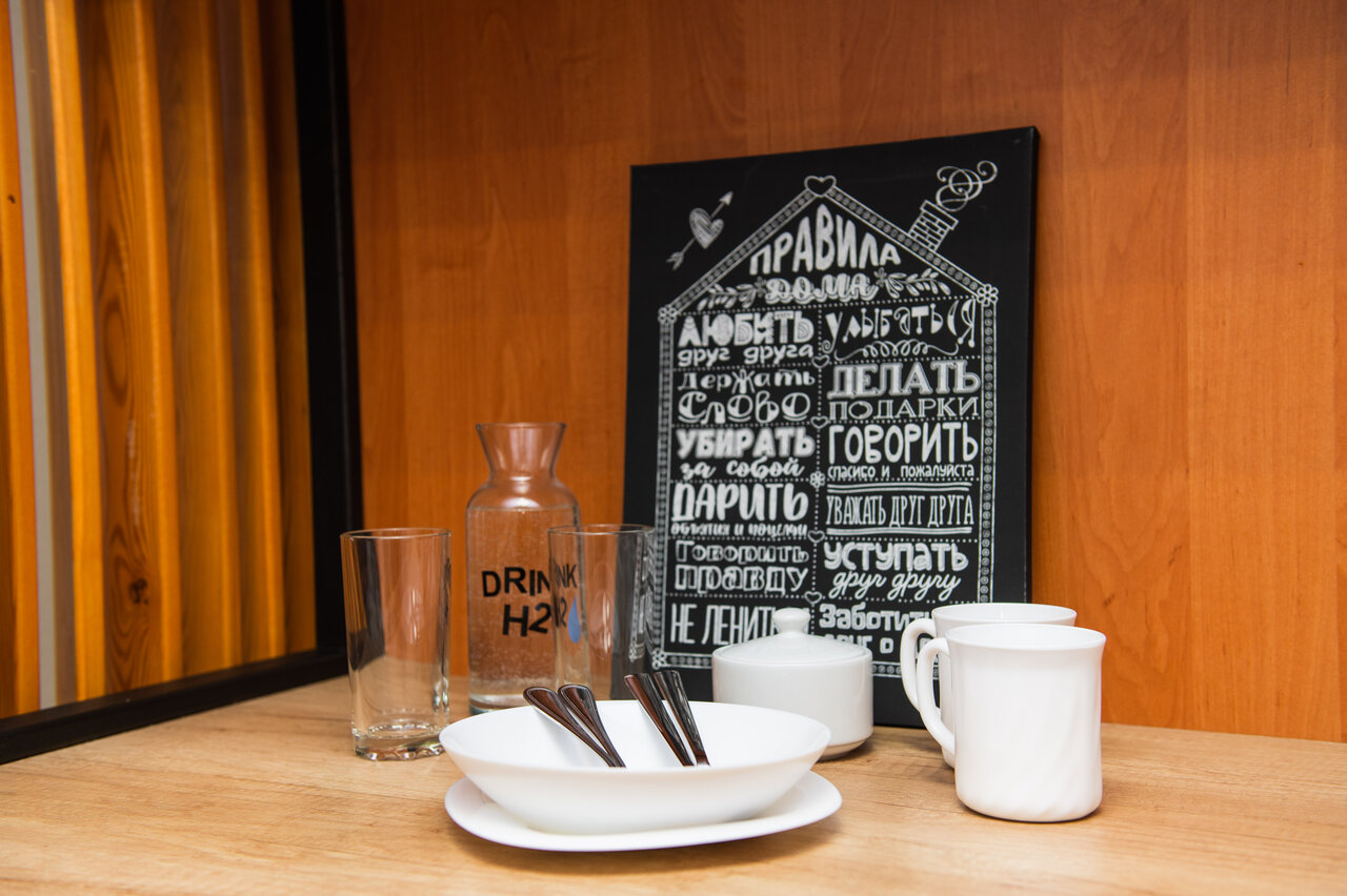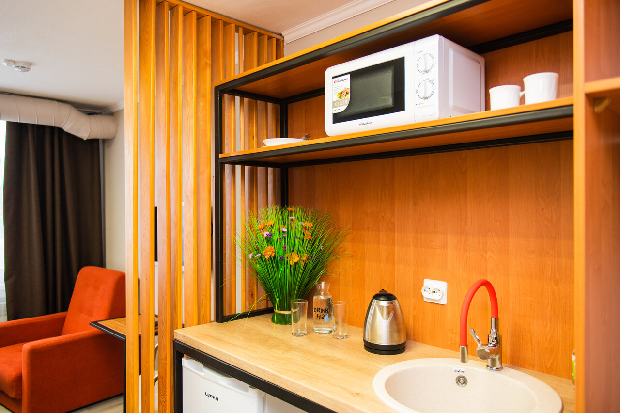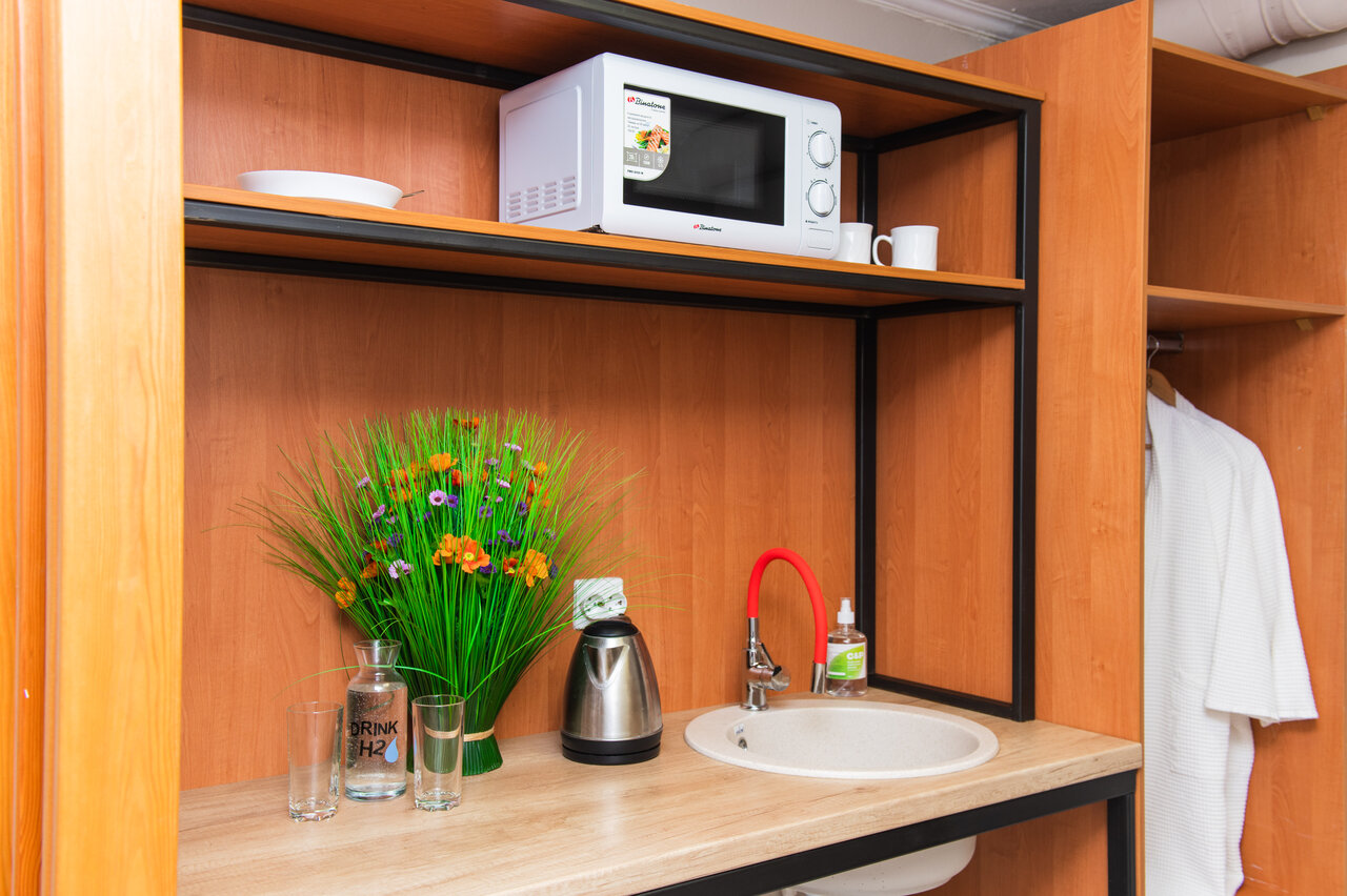 В каждом номере есть:- своя кухня со всей необходимой посудой и микроволновкой.- санузел с одноразовым набором для гигиены, тапочки, халаты.- парковка под видеонаблюдением.- кафе.- прачечная.Бесплатный чай, кофе – круглосуточно.