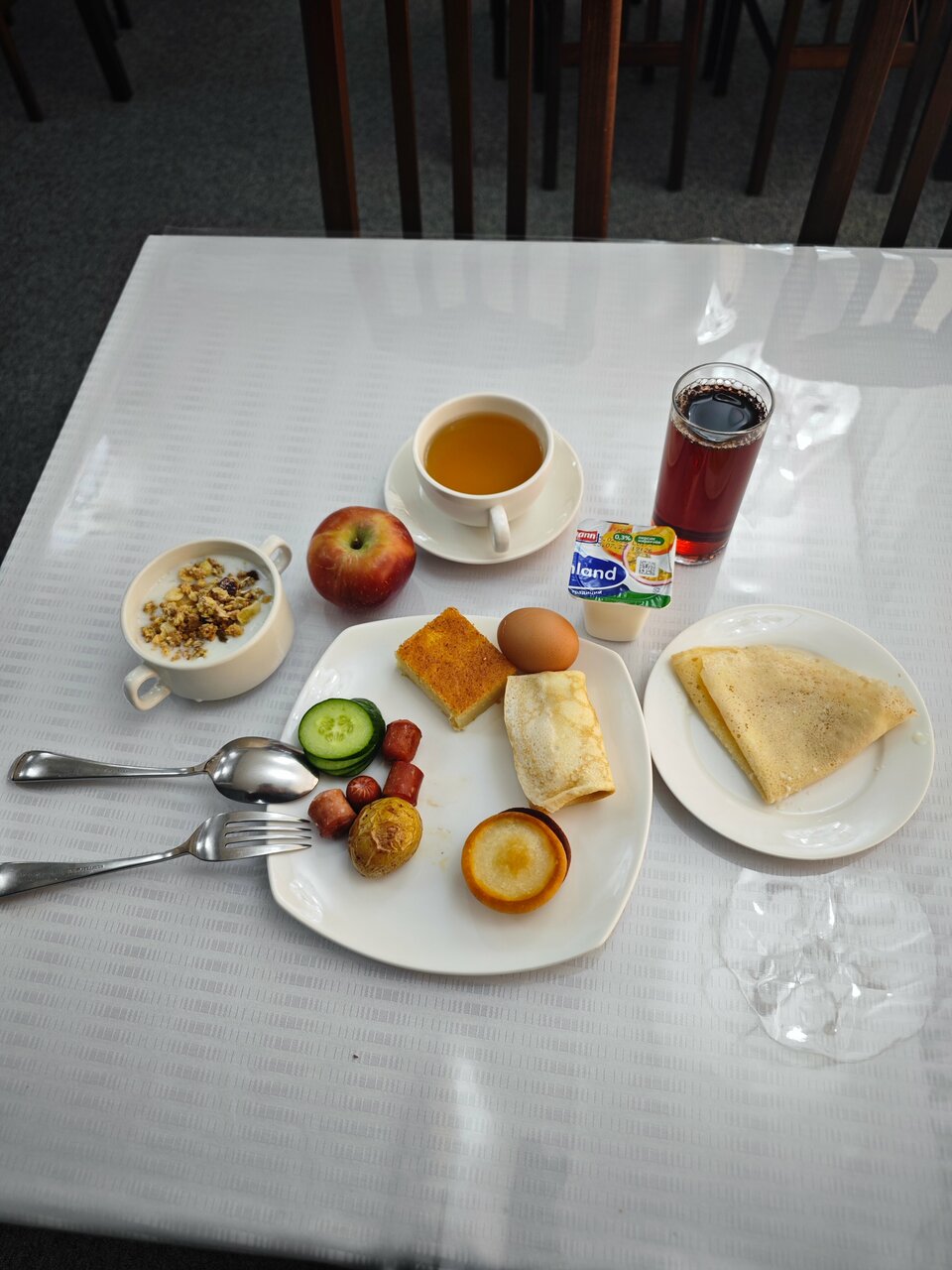 Завтрак просто отличный , подача разная . Либо предзаказ , либо шведский стол. Все свежее , кофе просто обалденный. Отдельная благодарность Шэф- повару. Очень хороший и общительный человек. Обслуживание на высоте, номера убирают, полотенца меняют. Всё подскажут и помогут. Единственное — это телевизор слабо принимает сигнал. Но лично для меня это не проблема. В остальном соотношение цена / качество 1000%. Так держать