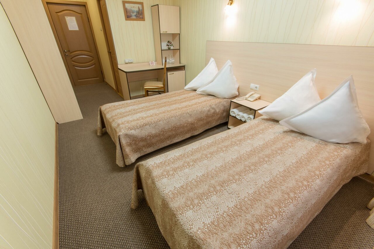 Трехместный стандартный номер площадью 20 кв.м. Односпальная кровать, раскладной диван. В номере санузел с душевой. Телевизор, холодильник, мкв-печь, чайник. Окно выходит в спокойный переулок.
