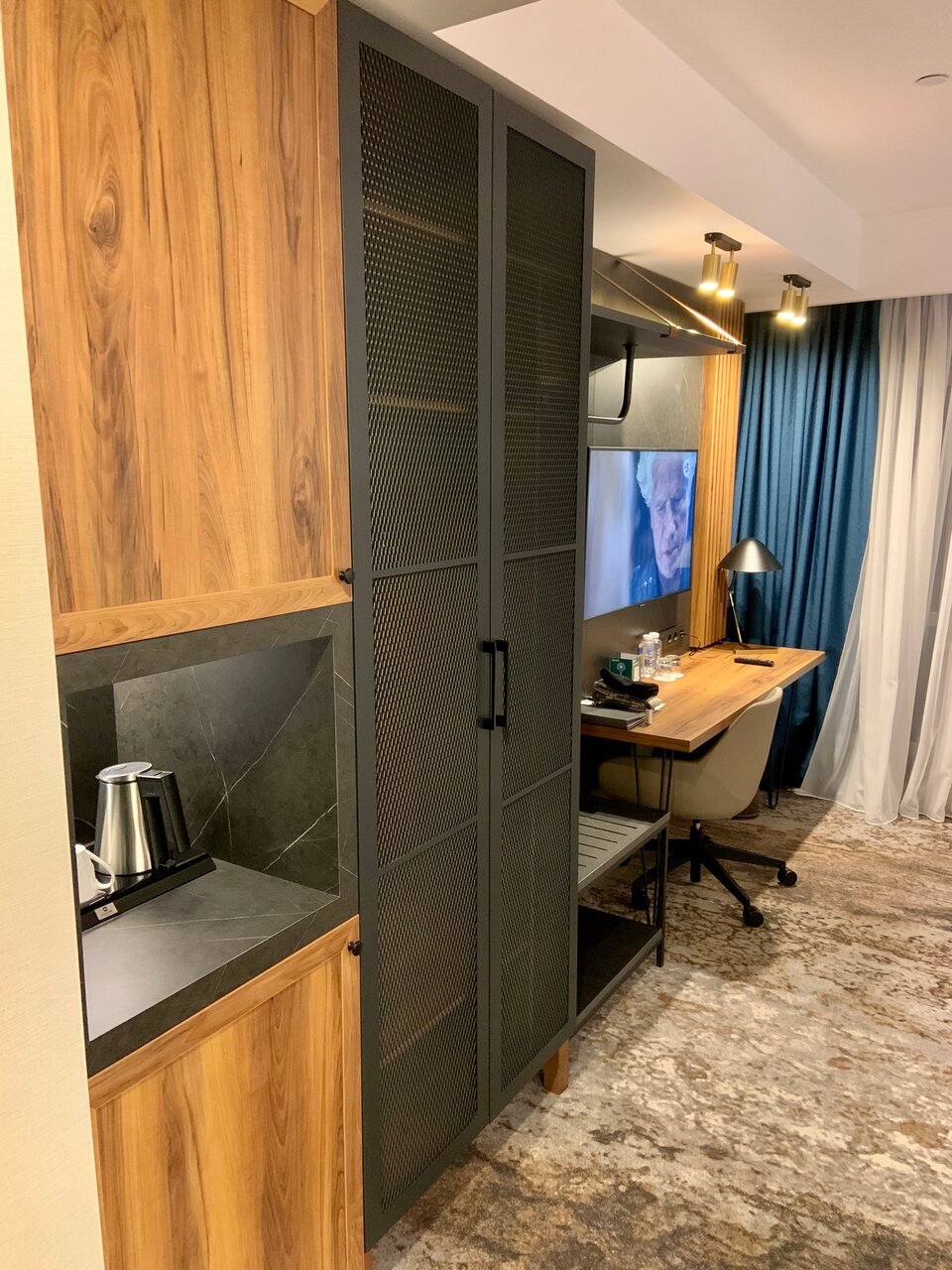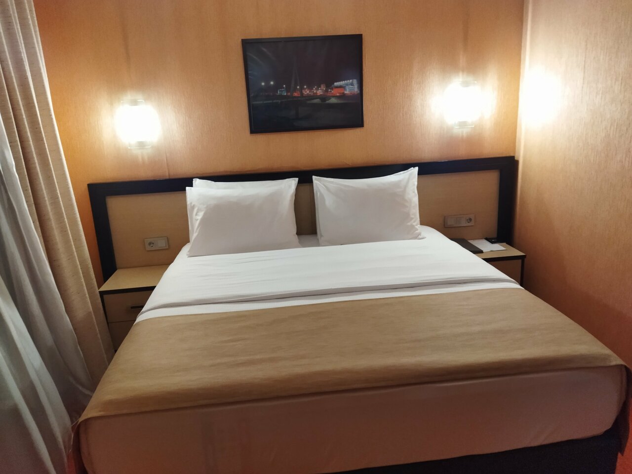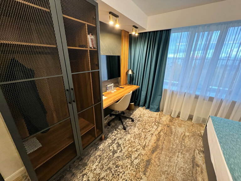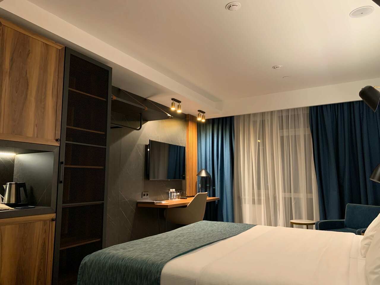 Отличное впечатление от отеля. В центре города. Дружелюбный рецепшн. Просторный и удобный номер, есть стол для работы, кресло, гладильная доска (в номере, в шкафу). Каждый день ставят воду…
