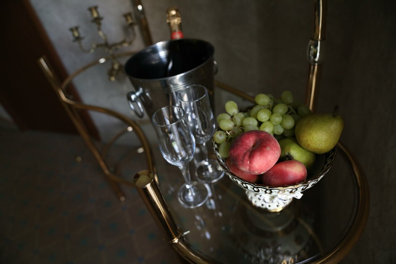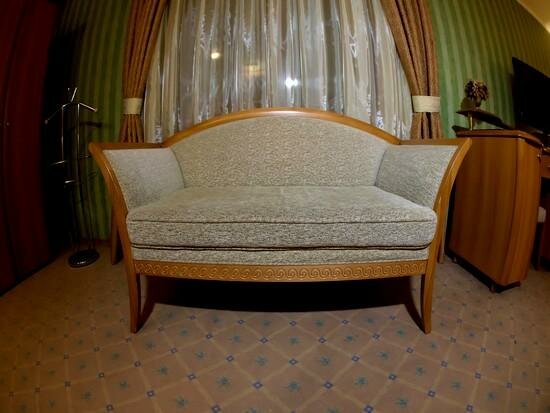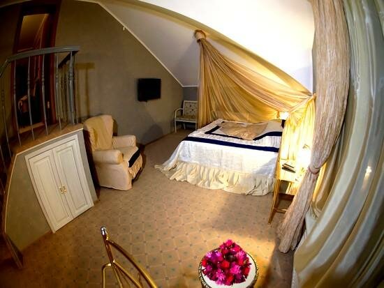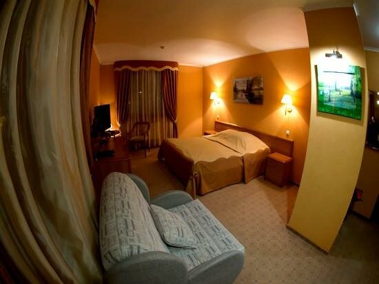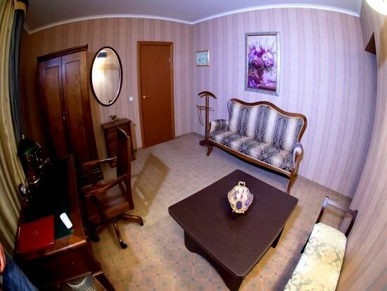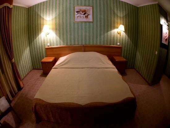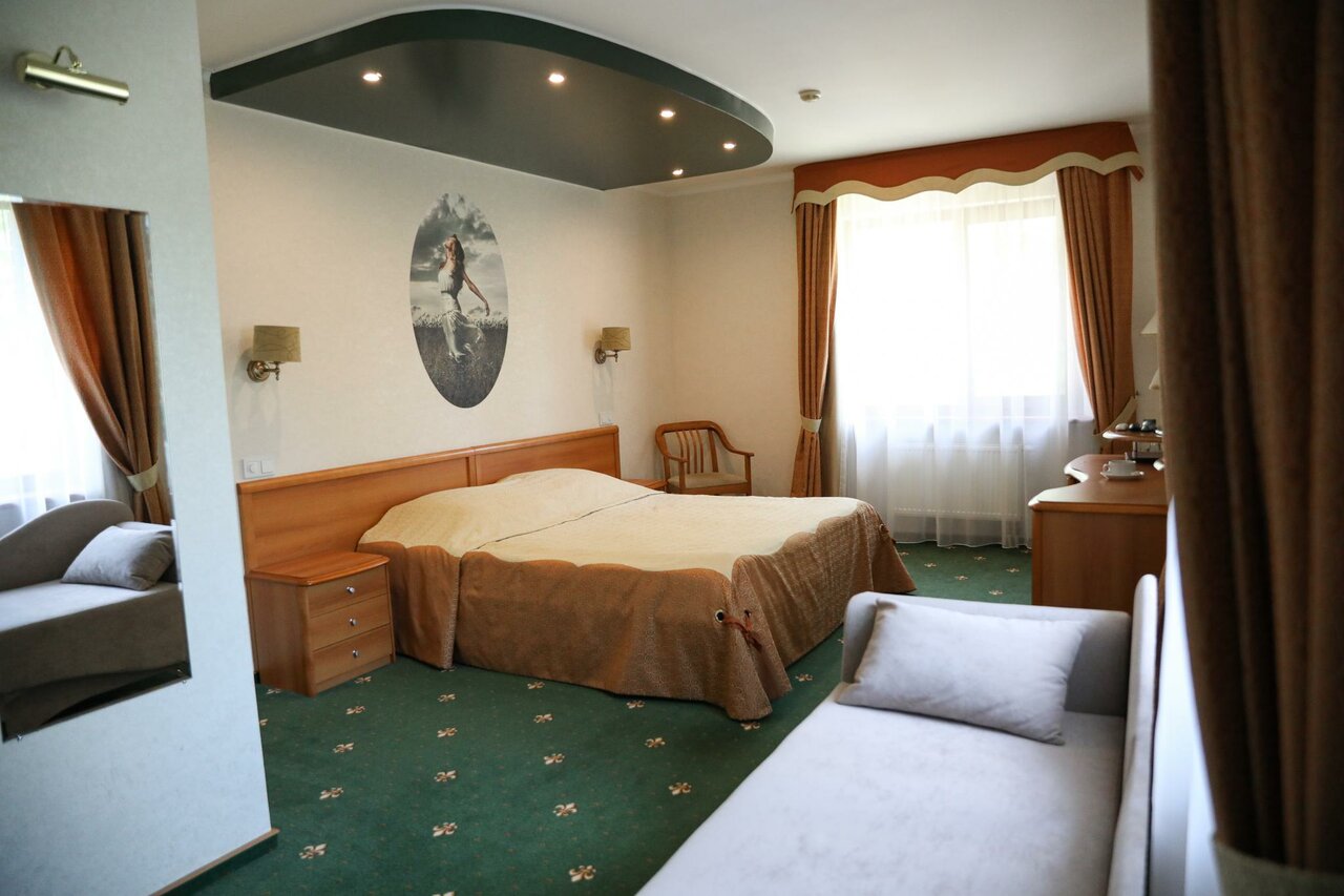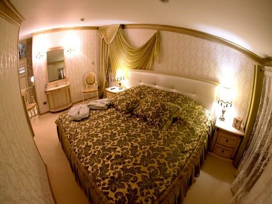 Двухкомнатный номер разделен на прихожую-кабинет, большую зону отдыха с пьедесталом с шикарной кроватью размера «kingsize». Один час сауны в подарок!