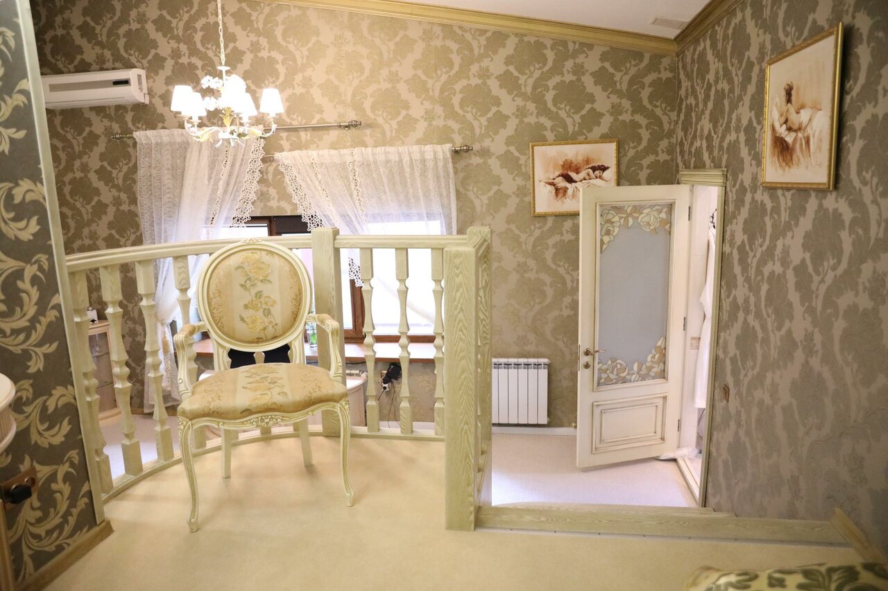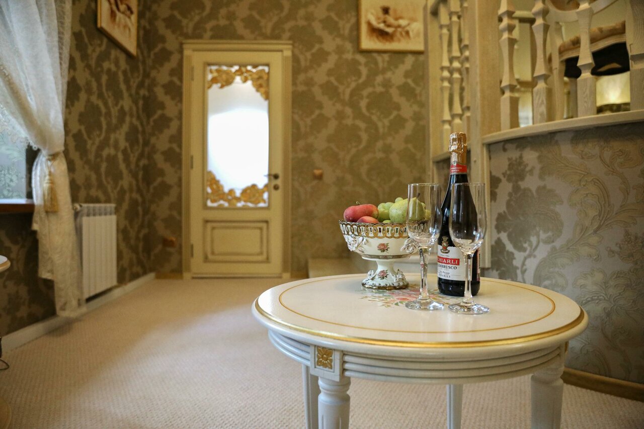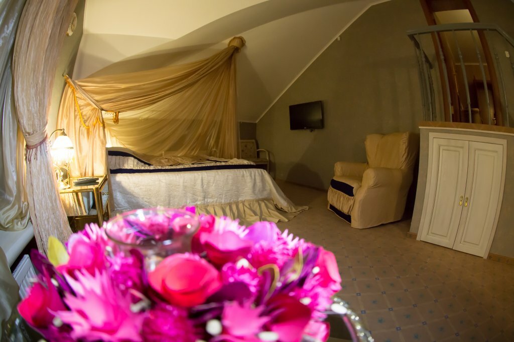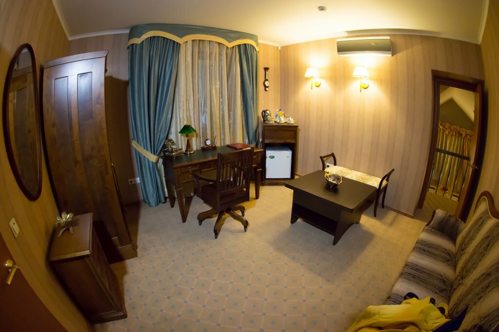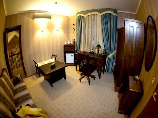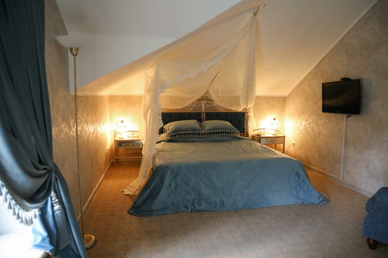 Двухкомнатный номер, удобная комната-кабинет для отдыха, в которой предусмотрена рабочая зона. Спальня, в которой вы обнаружите удивительно изящную мебель с элементами стиля «ампир», роскошная двуспальная кровать размера «kingsize» с балдахином.
