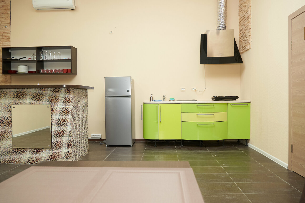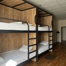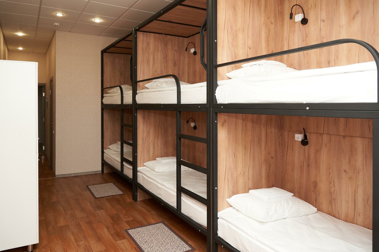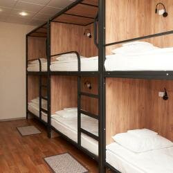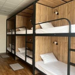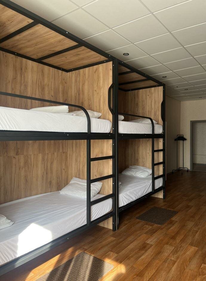 Просторный номер. Свежий ремонт. Новая мебель. Оборудован 2 -х ярусными кроватями с ортопедическими матрасами, индивидуальными шкафчиками с замком для каждого гостя. Имеется своя кухня и прачка.