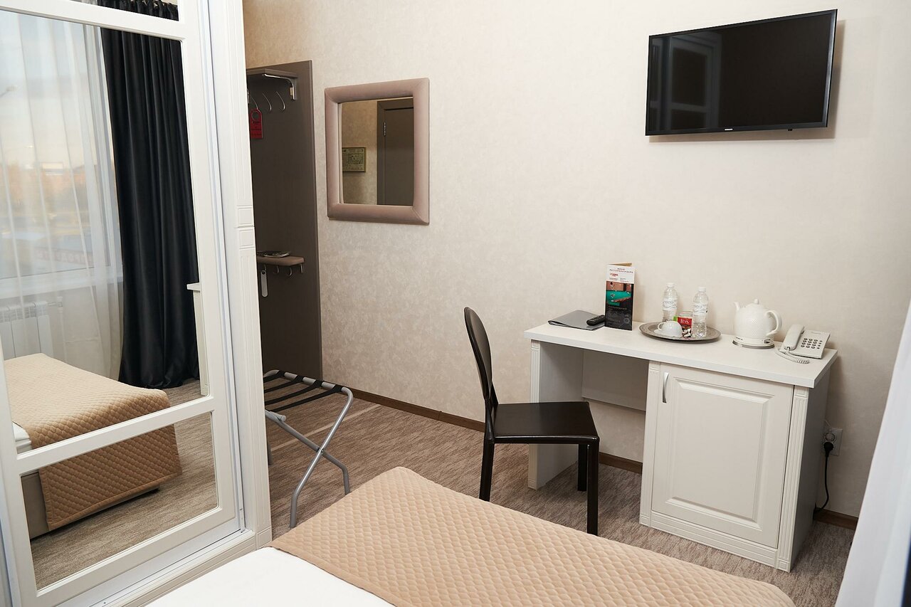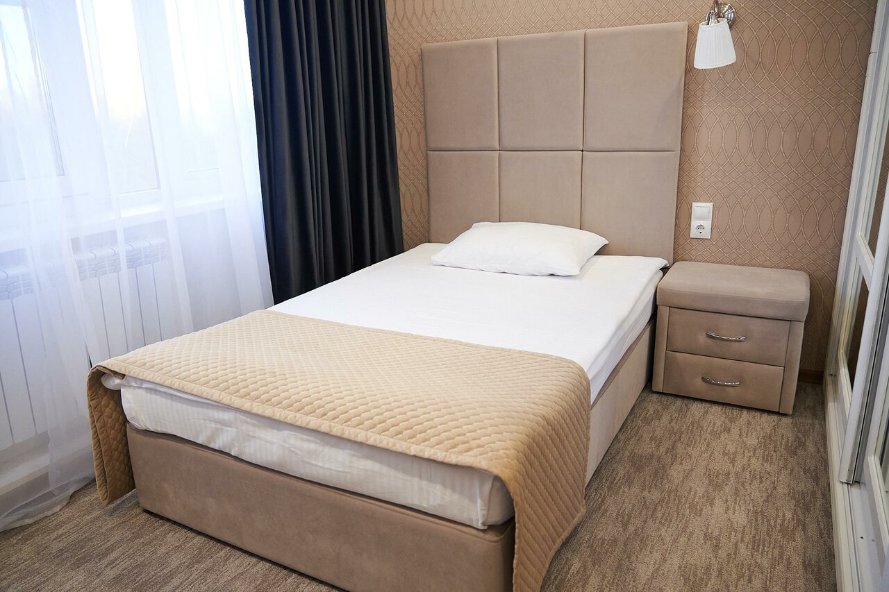 Уютный номер площадью 12 кв. м, располагает всем необходимым для комфортного проживания. В номере представлены односпальная кровать, чайная и рабочая зона, ванная комната с душевой кабиной.