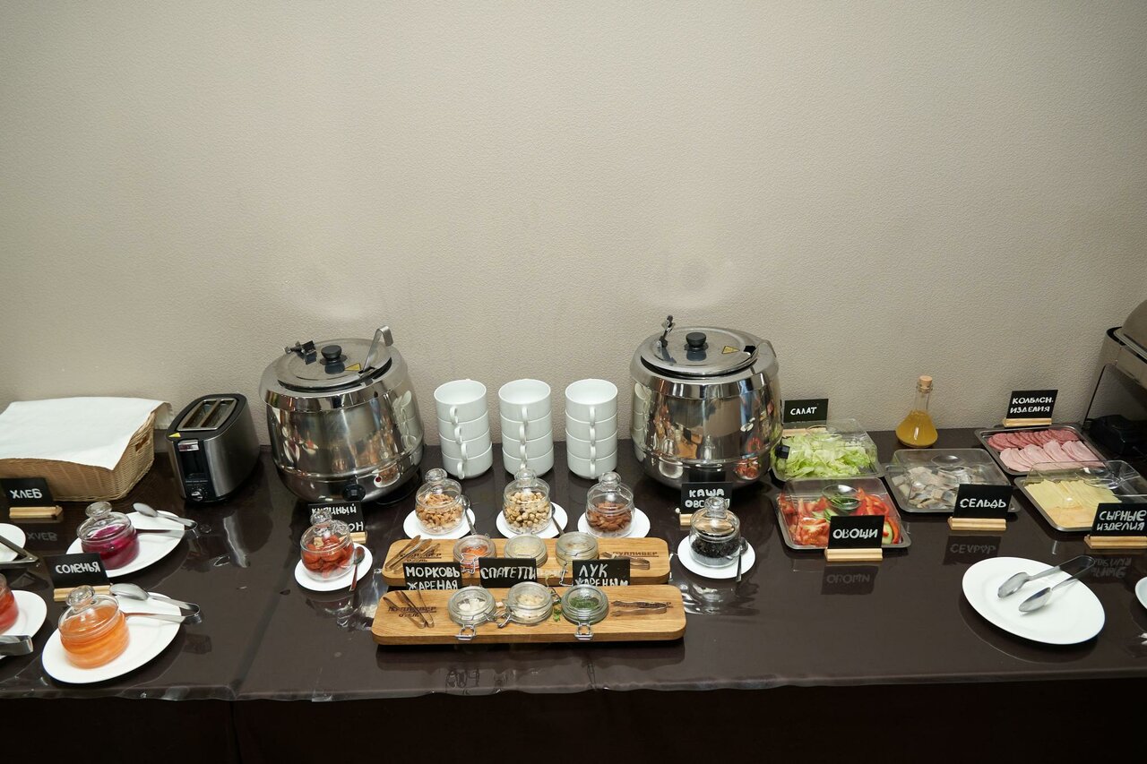 Ресторан площадью 100 кв.м. Открыт с 07/00 до 22/00 ежедневно, расположен на 3 этаже отеля. Предусмотрено банкетное меню и комбо-ланч/ужин для групповых заездов.шведский стол 7/00-10/00Ланч 12/00-16/00 Ужин 18/00-21/00Сервис рум с 7/00-22/00