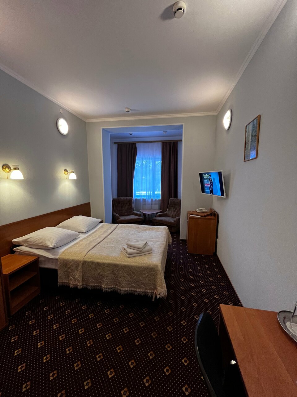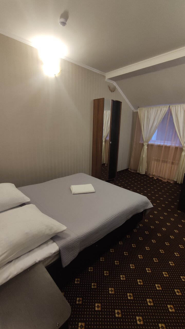 Останавливались на ночь 16.08.2024г. Разочарованы. Забронировали двухместный ПОЛУЛЮКС с видом на лес. При заселении обалдели: номер дали очень маленький с видом на трассу, шум машин непрекащаемый, солнечная сторона, кондиционера нет, окно крохотное, жарко, душно невыносимо, но есть вентилятор! И это ещё номер улучшенный после ремонта! По нашей убедительной просьбе номер заменили, но это только потому, что мы приехали рано в 14-00 и ОТЕЛЬ был полупустой. Про питание в этом месте даже говорить не хочется. Если вы очень голодны, тогда зайдёт и то не всё. Ощущение такое, что повар основные блюда готовит с утра, а официантки их просто разогревают. Пиццы, блины, пельмени, вареники, оладьи—заморозка из магазина не лучшего качества по двойной цене. Если утром захотите выпить кофе из автомата около ресепшена, категорически не рекомендуем, за 150 рублей автомат вам выбрызгает 50 грамм молока и 5 грамм КОФЕ- и это КАПУЧИННООчень недовольны, никому не рекомендуем.