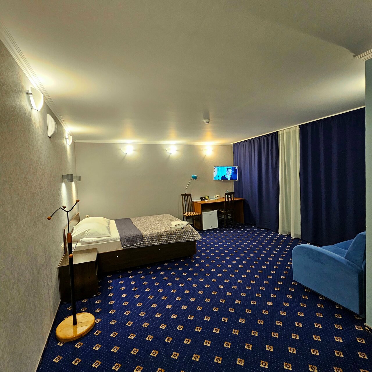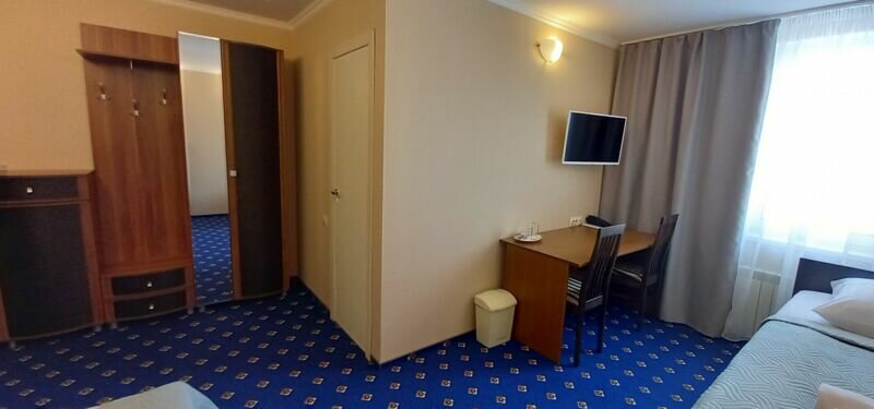 В номере с собственным санузлом, туалет, раковина, душевая кабина, халат, фен, набор полотенец, шампунь, гель для душа, мыло, зубной набор. Wi-Fi, телефон, ЖК-телевизор, стол, стулья, шкаф, прикроватные тумбочки, зеркало, двухспальная кровать