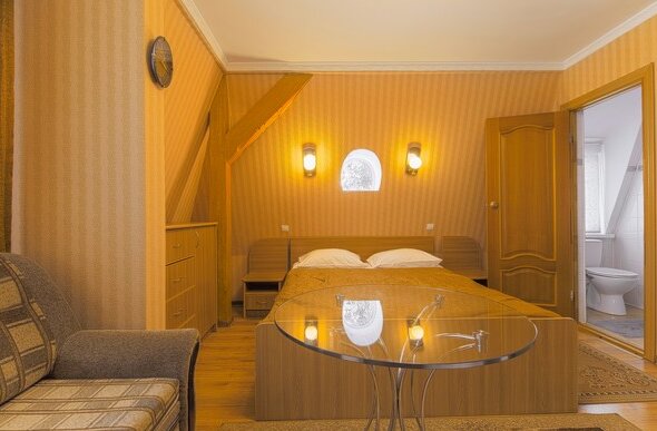 Апартаменты Люкс с двуспальной кроватью и личной кухней:Уютные апартаменты, полностью оборудованы комфортной мебелью, собственной мини кухней.В номере имеется: двуспальная кровать, душ, санузел, постельное бельё, полотенца, средства личной гиг...