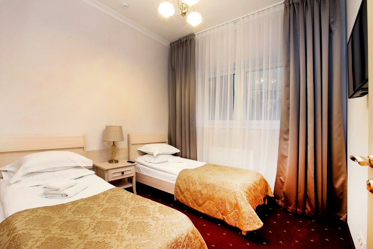 Двухместный однокомнатный номер 14 м², две раздельные кровати, санузел, ванная с подогреваемым полом в номере. Телевизор, холодильник, кондиционер, бесплатным WiFi на всей территории отеля, косметические средства.