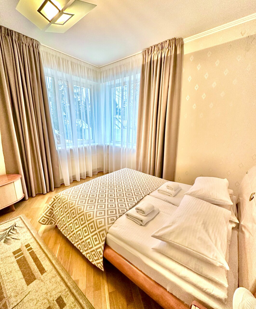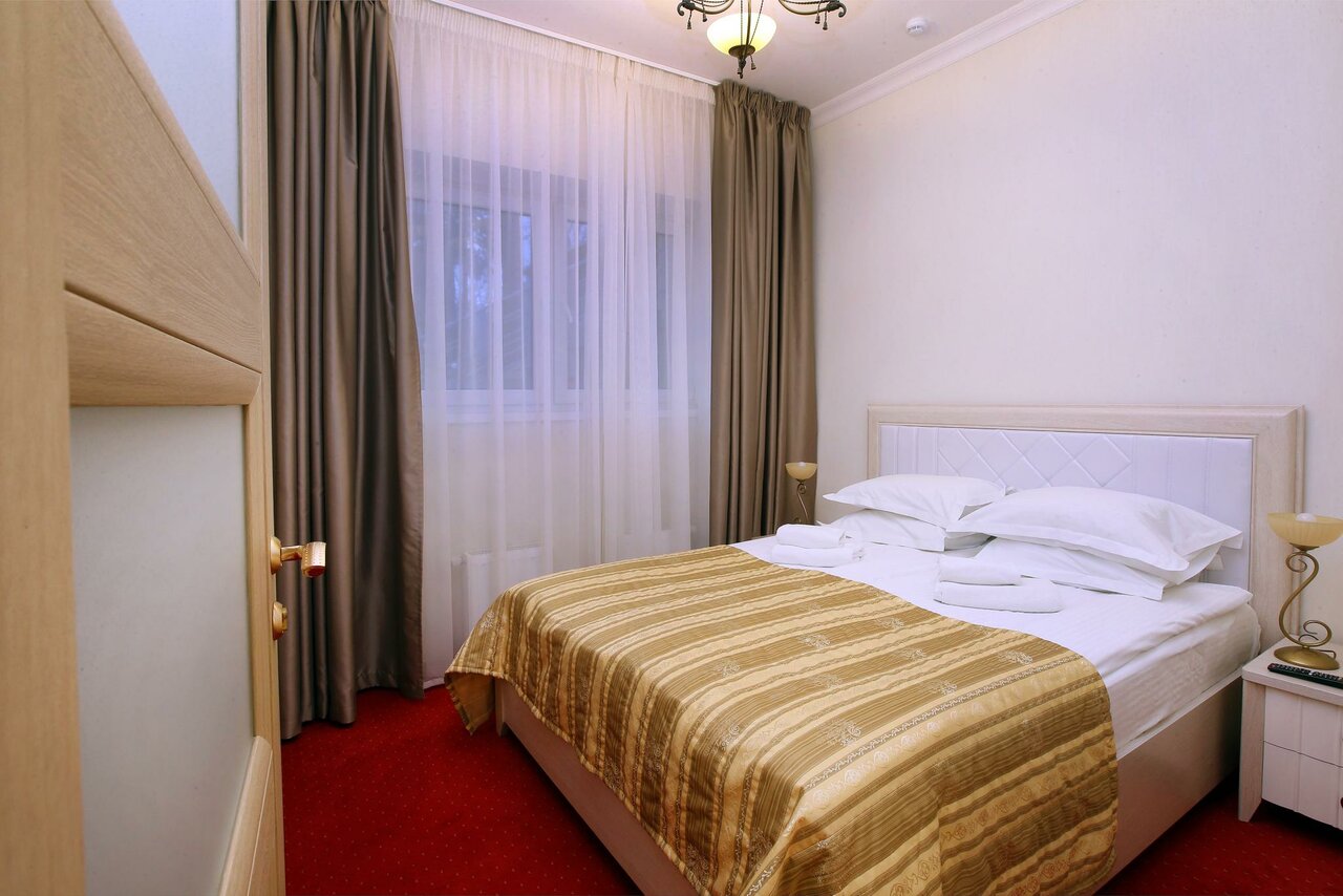 Однокомнатный номер 22 м², с большой двуспальной кроватью, большой плоский телевизор, холодильник, кондиционер, телефон, чайник, чайные принадлежности, санузел, ванна джакузи, подогреваемый пол, фен, тапочки, халаты, косметические средства.