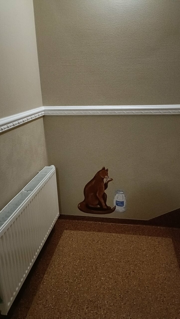 - Приятный интерьер с тематическими рисунками (кошки, стиль семьи Гретты).