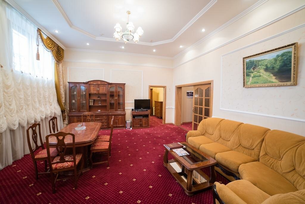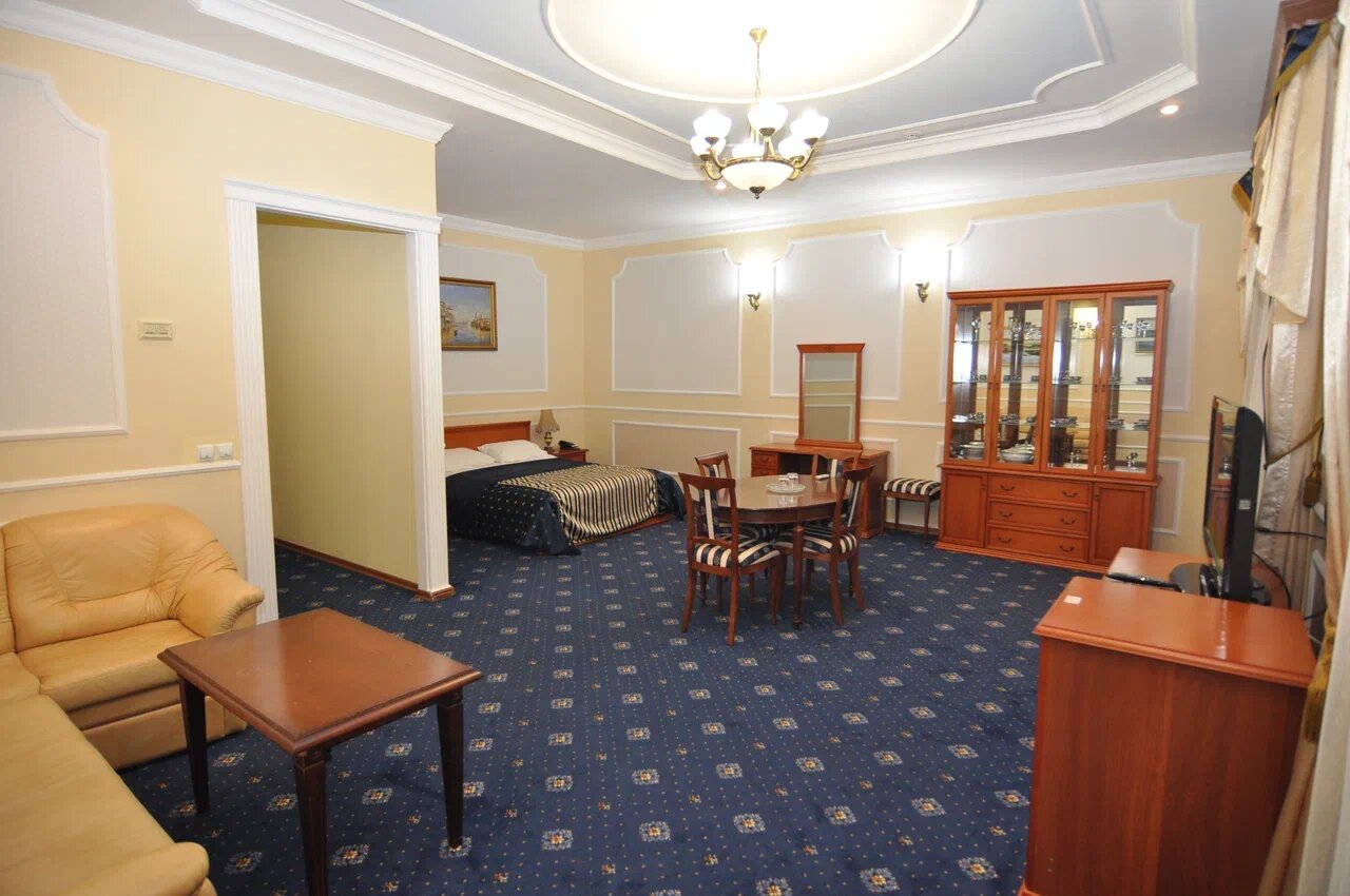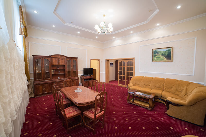 Высококлассный 'Президентский' номер с одной двуспальной кроватью и одним двухместным диваном оснащён телевизором, столом, стульями, креслом, диваном, шкафом, тумбочкой и сейфом для хранения ценных вещей, а так же просторной личной ванной комнатой с