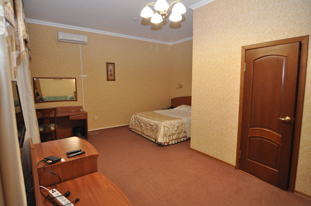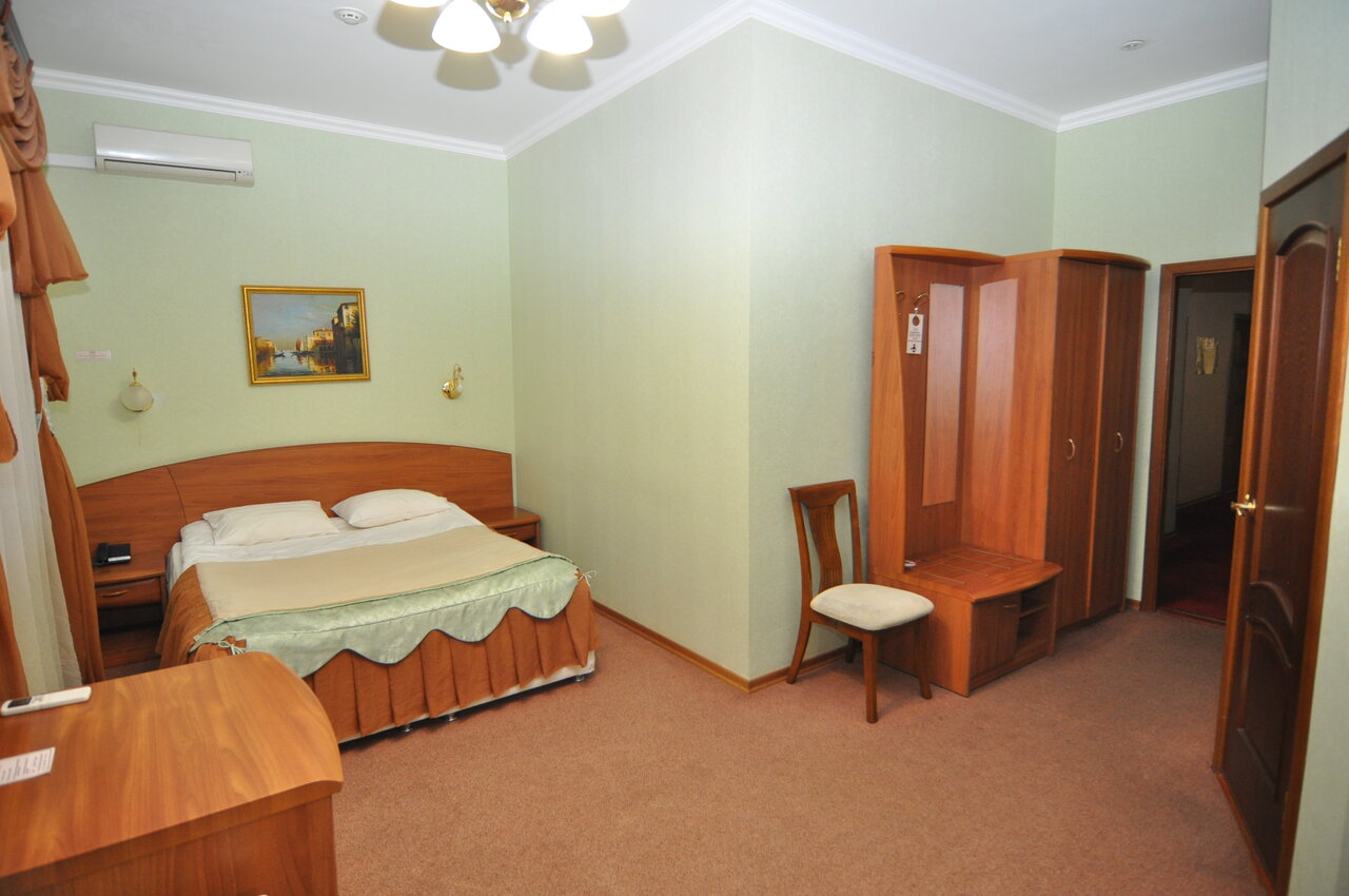 Комфортабельный двухместный номер с одной двуспальной кроватью оснащён телевизором, столом, стульями, креслом, диваном, шкафом, тумбочкой и сейфом для хранения ценных вещей, а так же личной ванной комнатой со всеми необходимыми ванными принадлежностя
