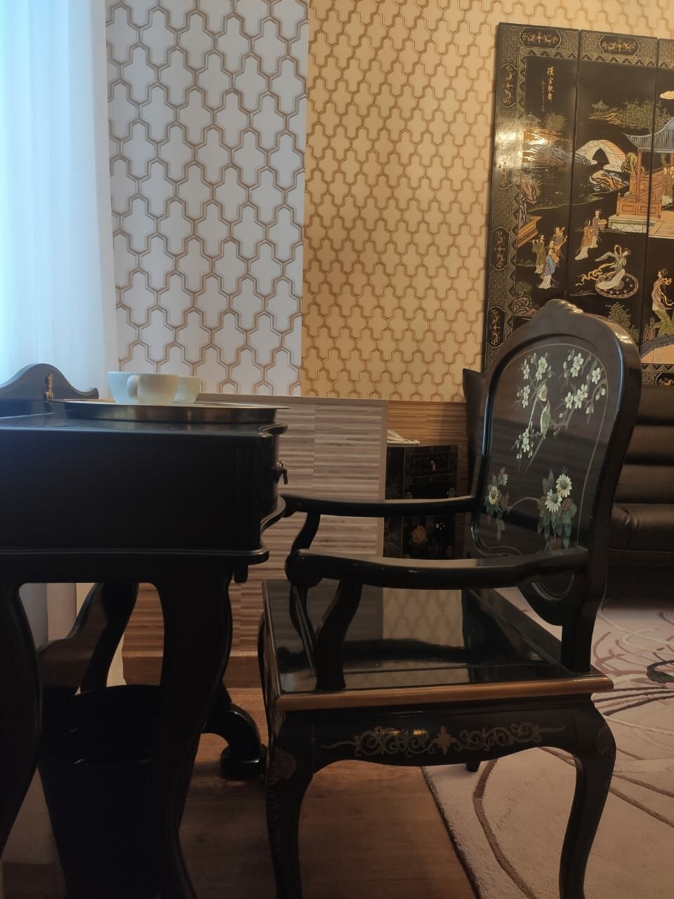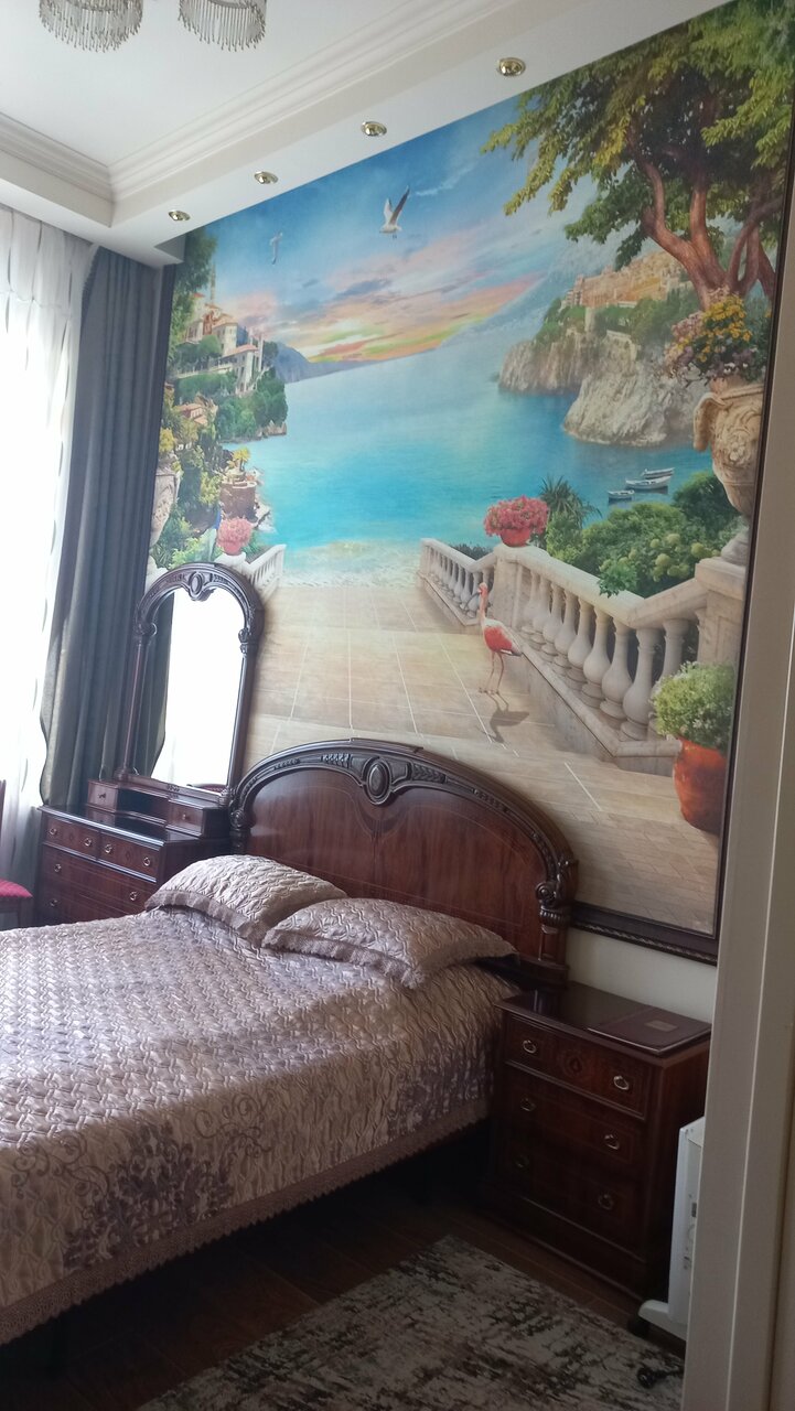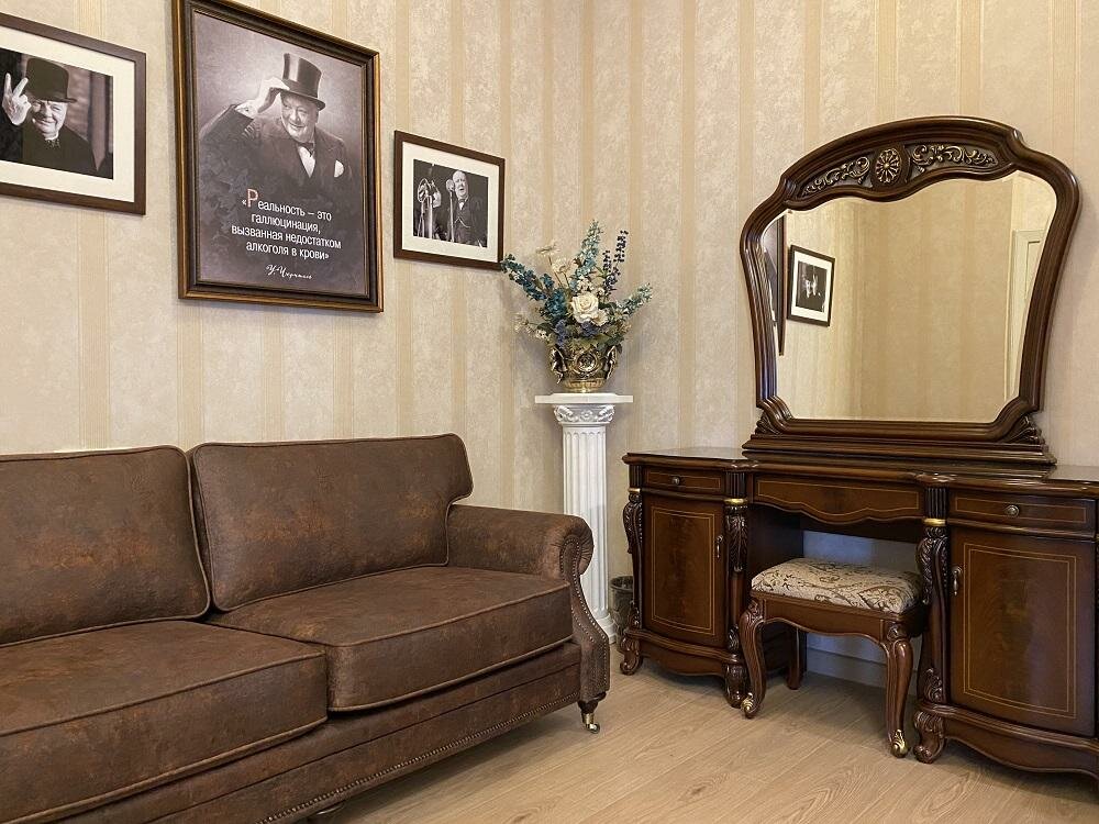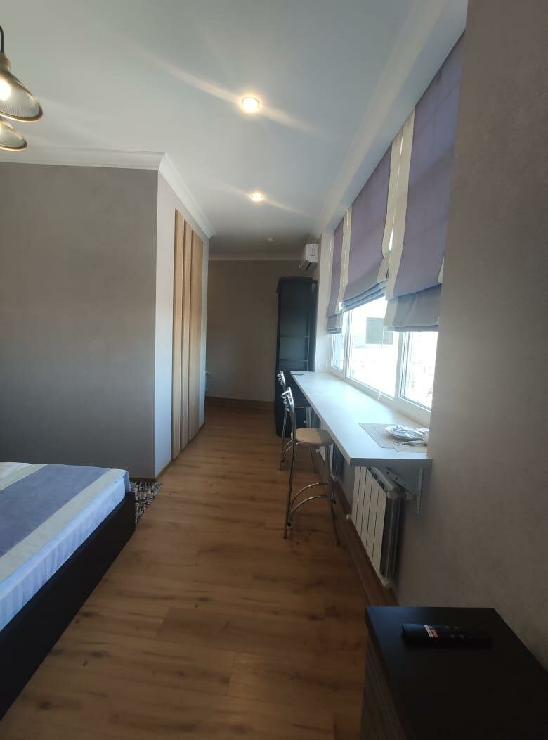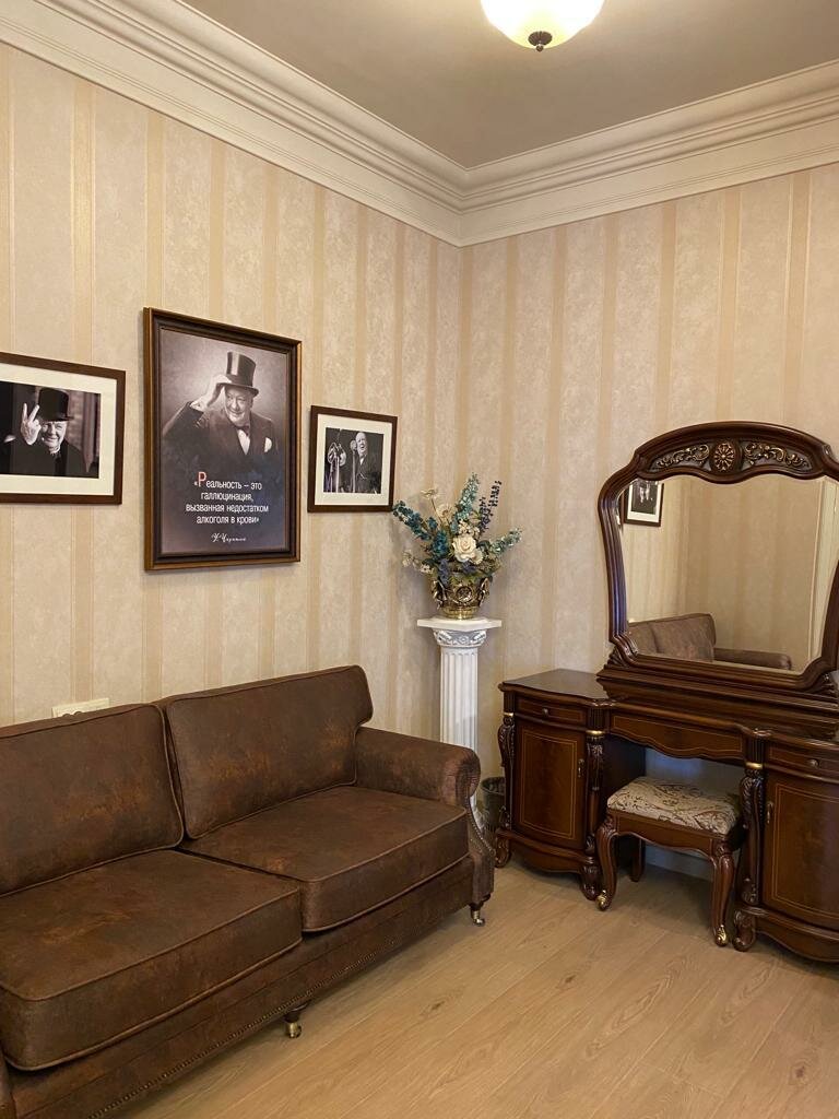 Однокомнатный, две кровати, трансформируемые в двуспальные,тумба, 2 кресла, обеден. стол, стул, шкаф,LED TV, сплит, телефон, холодильник, посуда, с/у с душ кабиной,банно-косметич. принадлежности. S-28m, h-3,5m м/пл. звуконепр. окна