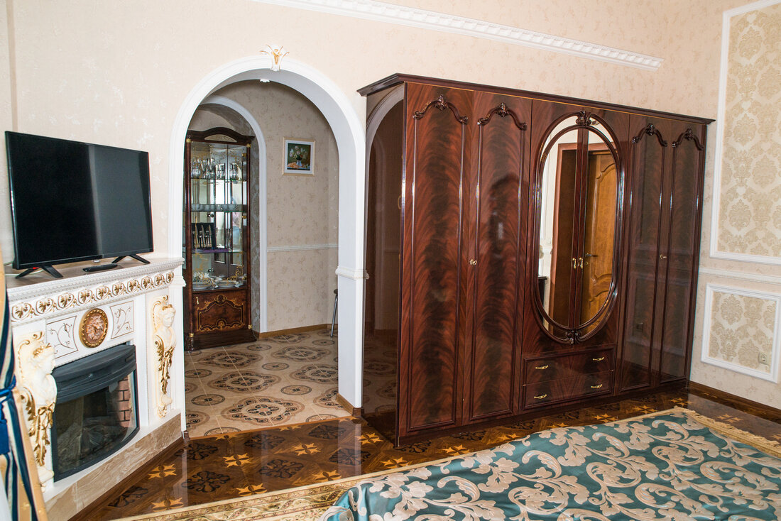 Однокомнатный, двухзонный, 2-хсп, кровать с балдахином, камин, раскладной диван, шкаф, стол, столик журнальный, туалет.стол.,LED TV сплит, холодильник, посуда, телефон, с/у с ванной, банно-косметические принадлежности (шампунь, гель, мыло.S-28m,h-3,5