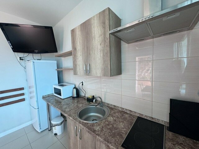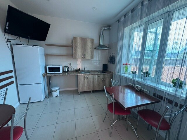 Очень понравилось. 1. Расположение — центр. 2. Собственная кухня — всё что нужно (холодильник, микроволновка, чайник, посуда, ножи, ШТОПОР). 3. Вечером, после всех дел, можно сидеть на балконе второго этажа и наблюдать за тренировками мальчишек и девчонок. Попивая пиво.