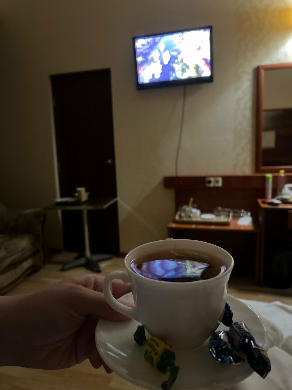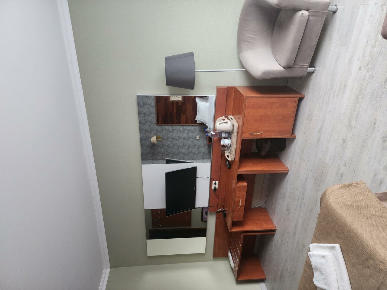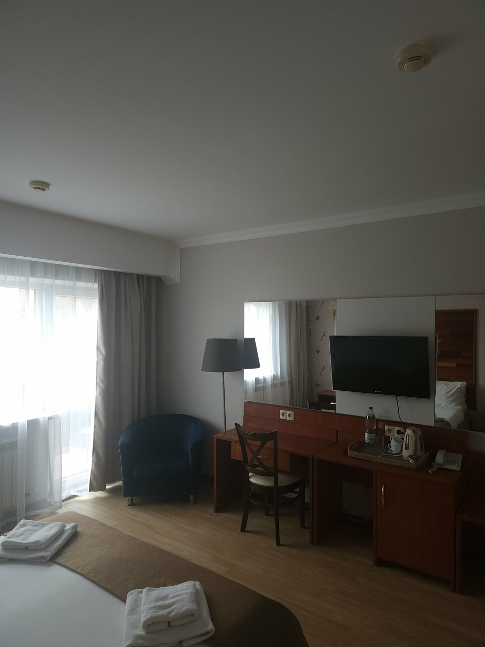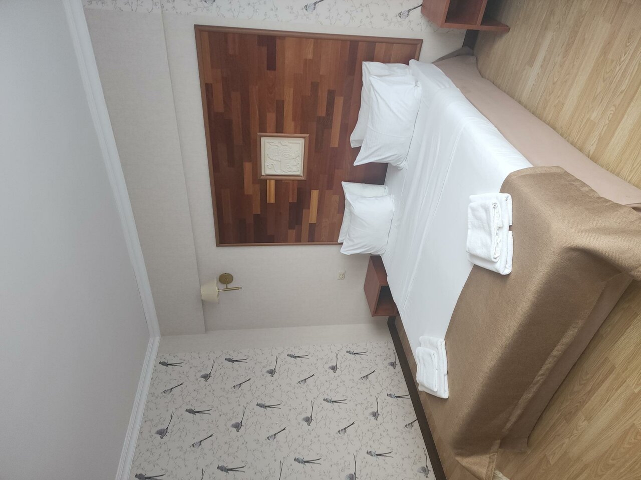 Приехал вечером хотел поужинать, но кухня уже не работала. В комнате был специфический не свежий запах сырости. Укараша номер ‘лебедь’ из полотенца и зеркало на потолке. Для командировки на одну ночь вполне нормально.