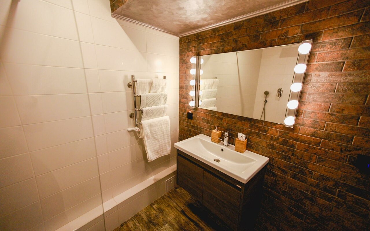 Заказывала номер Art на годовщину с мужем. Реальность превзошла ожидания)) все очень понравилось — номер очень чистый, уютный, со всем необходимым — даже салфетки для обуви дали) бесплатно воплотили пожелание о романтической обстановке — лепестки роз, свечи и фонарики)) заказывали сауну там же, также все очень красиво и чисто) утром за 250р очень сытный завтрак, наелись аж до вечера)) Всем советую)