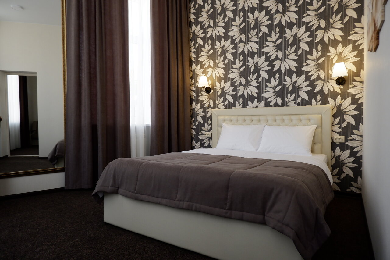 Отель в центре города, неплохой, но не более. Парковки нет, еле нашли место на соседней улице. Номера небольшие, у нас номер выходил на ул.Петровскую и половину ночи мы слушали машины с громкой музыкой, потом с утра люди поехали по делам, снова машины. Окно открываешь — невозможно спать, очень шумно. Закрыли окно, хотели включить кондиционер, не нашли ни одного пульта ( кондиционера два). Сверху слышно, как ходит кто-то. Слышимость жуткая, в коридоре ходят, а мы слушаем… и это ,,люкс,,!!! На завтрак можно было выбрать кашу, яичницу с сосисками или горячий бутерброд, чай или кофе и десертик. Мы выбрали фруктовый чай, утром пришли, нам сказали, что есть только чёрный или зеленый. Еда нормальная, но не для отеля с тремя звёздами. В общем кроме его местоположения ничего толкового мы не нашли (((