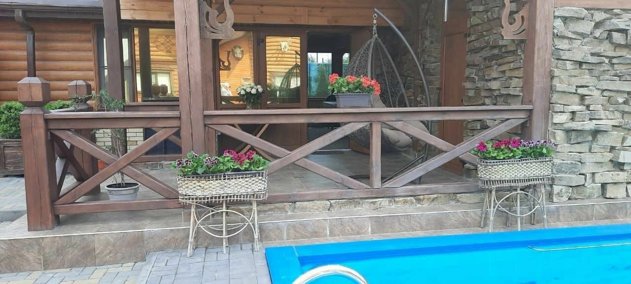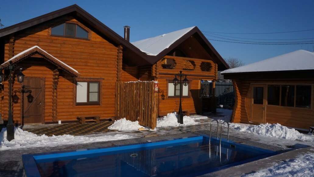 2 бани из деревянного сруба. Подогреваемый круглогодично бассейн. Комнаты отдыха.