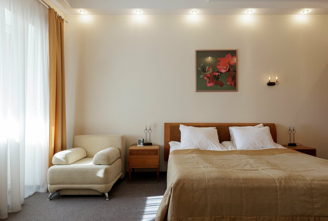 Одноместный номер с двуспальной кроватью со всеми удобствами. Бесплатный Wi-Fi, чай, кофе, питьевая вода.