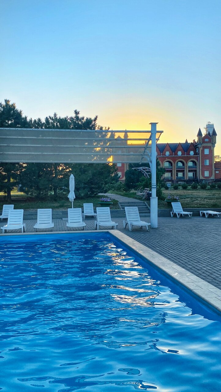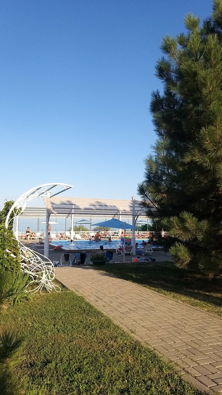 Хорошая гостиница на берегу Азовского моря, приветливый и внимательный персонал. Есть собственный пляж и бассейн, тенисный корт, ухоженная цветущая территория.