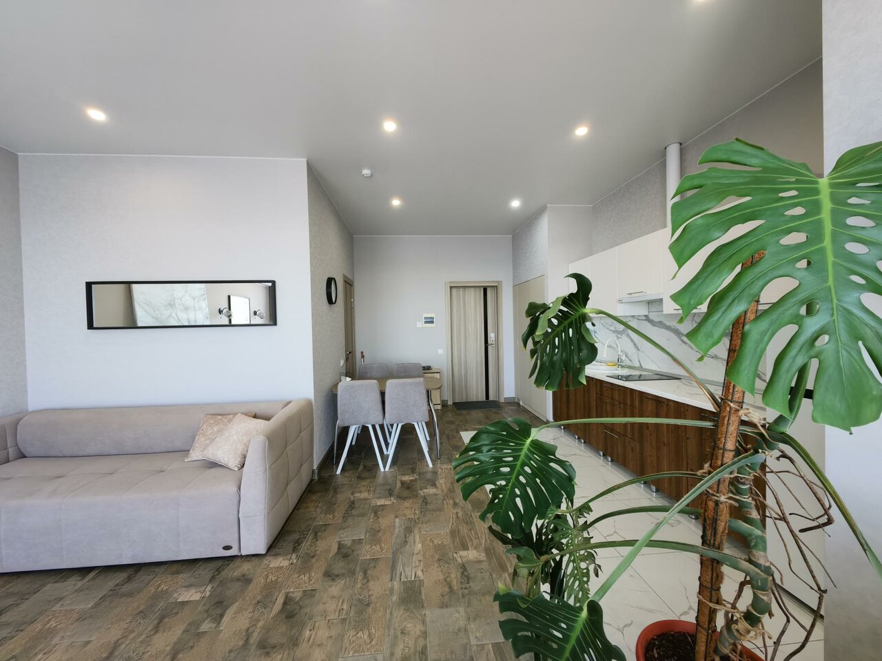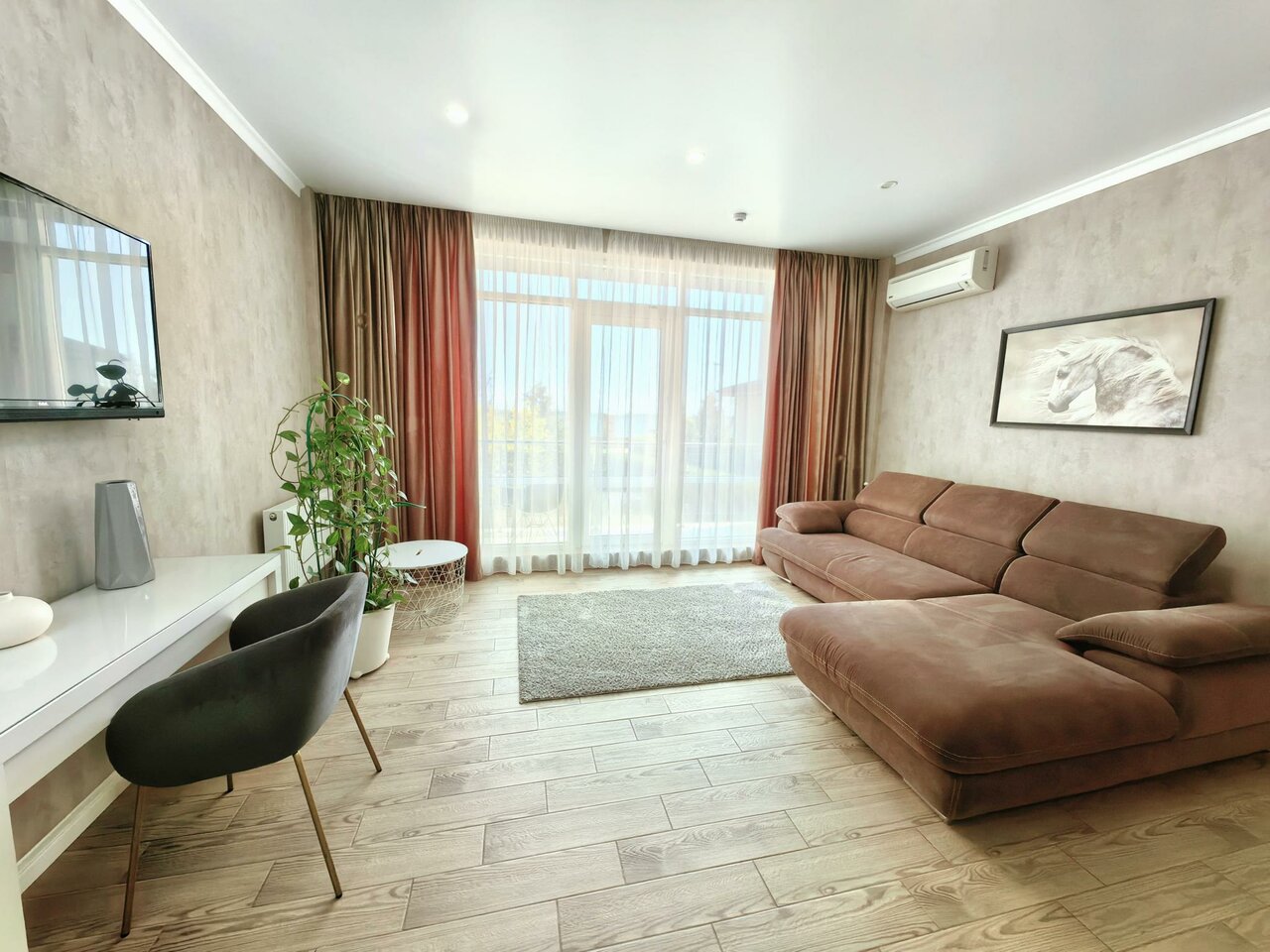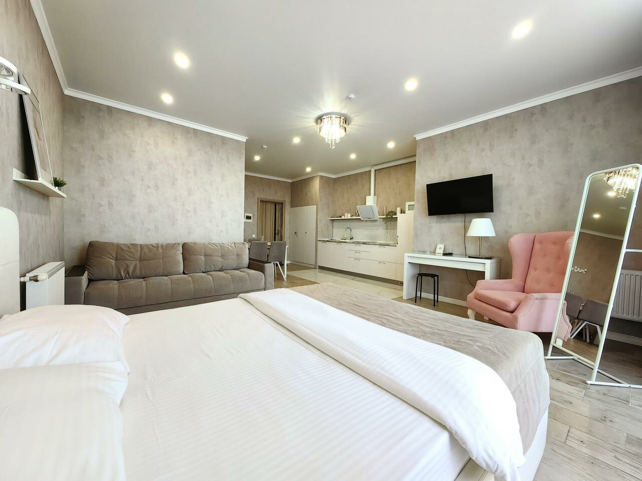 Студия 40м с балконом (вид на море). Оборудована кухней, двуспальная кровать и раскладной диван (четыре спальных места).