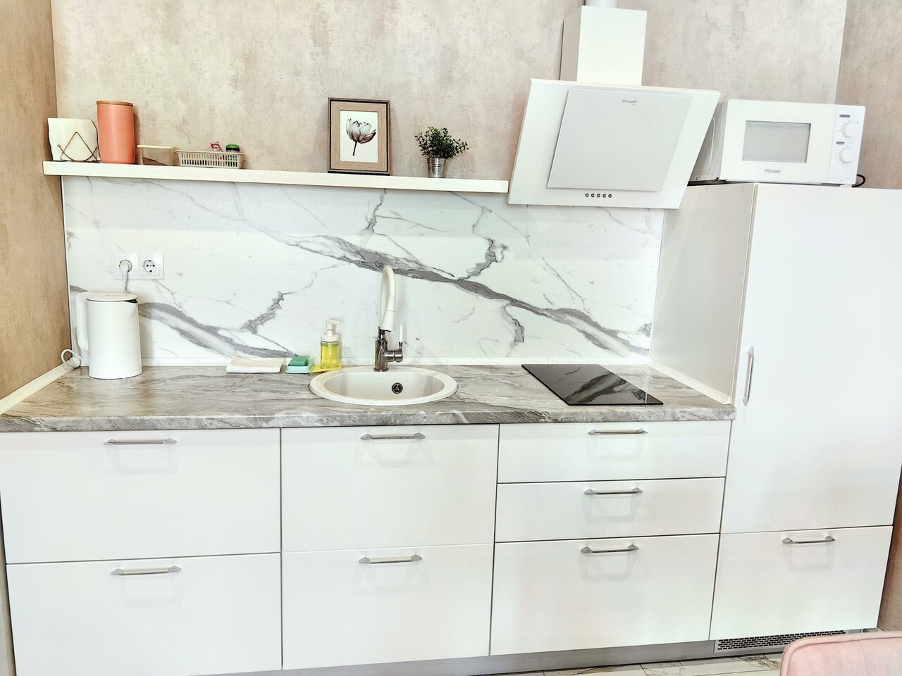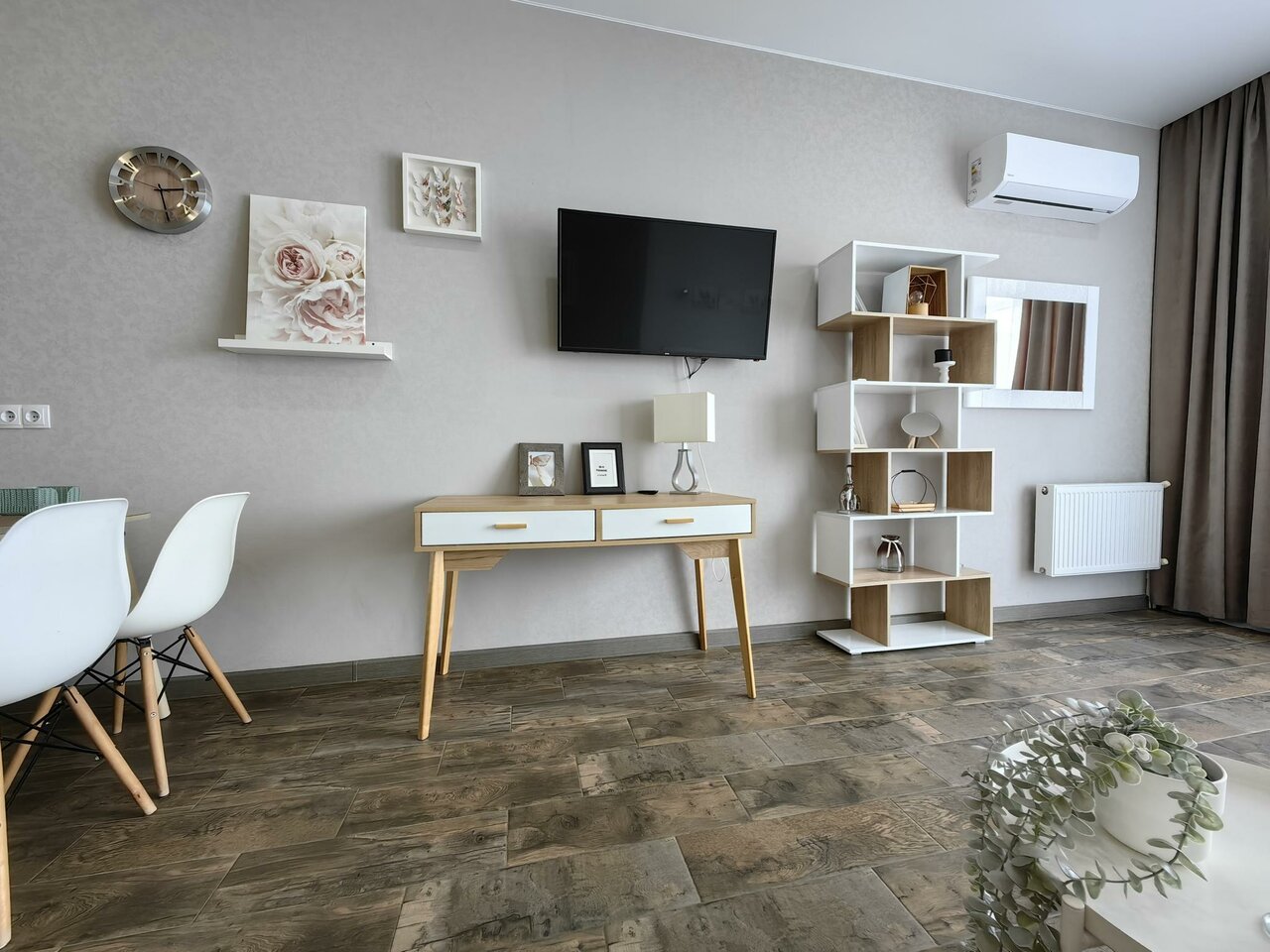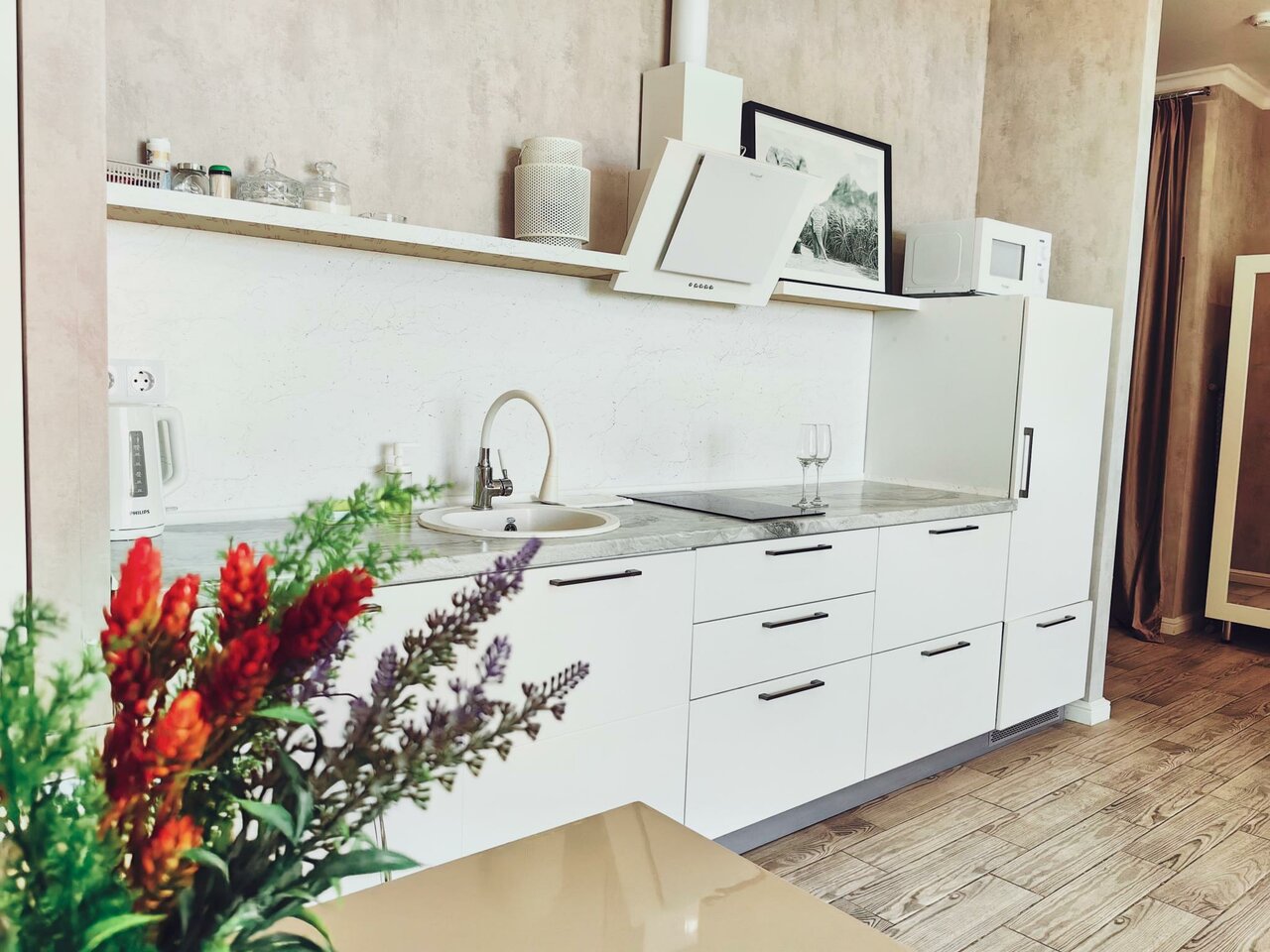 Студия 40м с балконом (вид на море). Оборудована кухней, двуспальная кровать и раскладной диван (четыре спальных места).