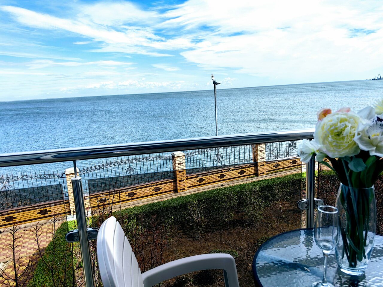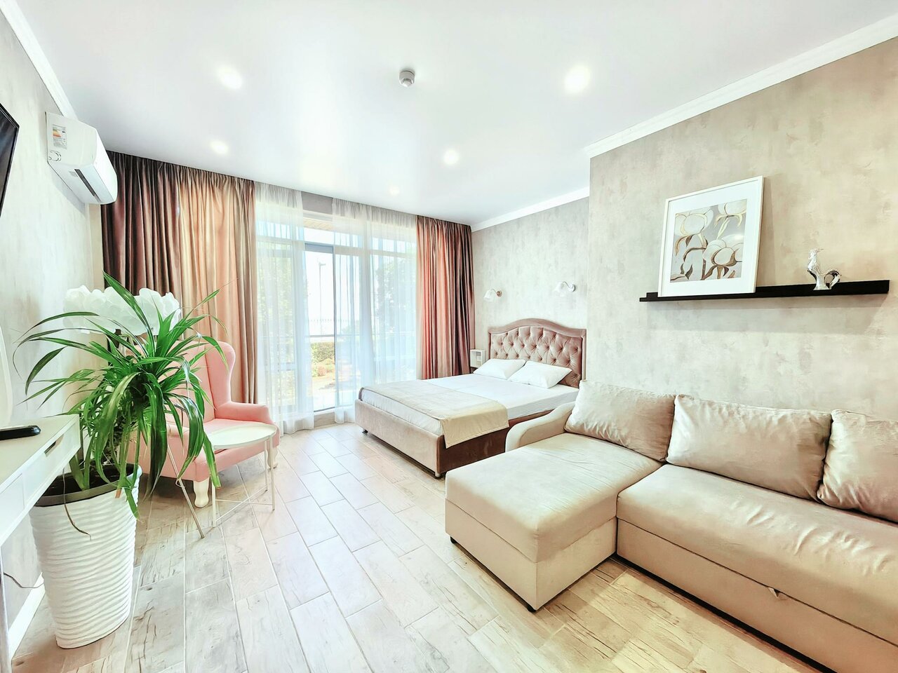 Студия 40м с балконом (вид на море). Оборудована кухней, двуспальная кровать и раскладной диван(четыре спальных места).