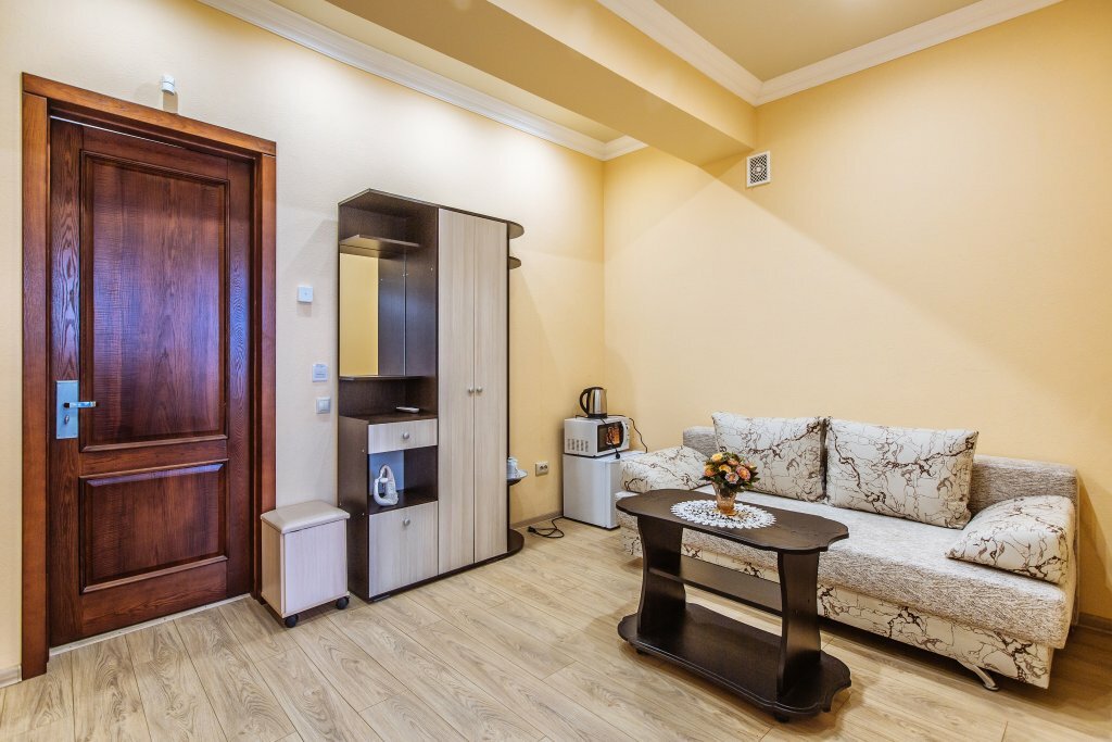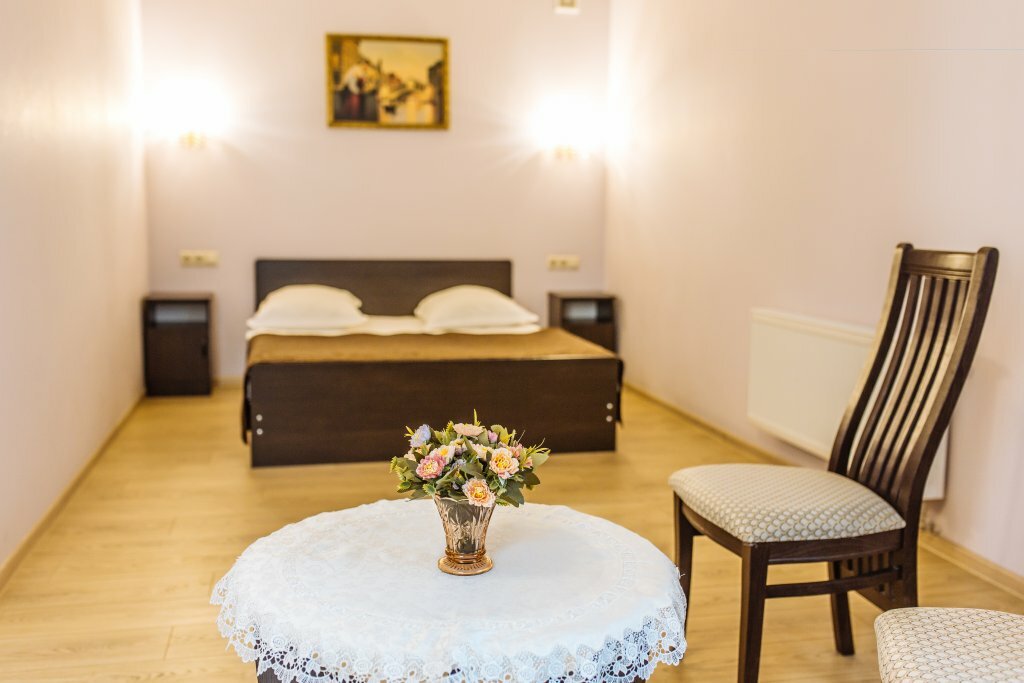 Прекрасный семейный номер на 4 человек, есть маленькая удобная гостиная с диваном, отличный качественный холодильник, из гостиной идут две отдельные комнаты, в каждой комнате по телевизору. Хочется написать про туалет: огромная туалетная комната, с большим душем ( не душевой кабиной) имеются все необходимые принадлежности даже тапочки. Номер чистый. Гостиница находится недалеко от городского парка, можно отлично погулять, рядом с гостиницей магазин 5, много разных кафе. Нам очень понравилось. Тихо, уютно, закрытая стоянка для машин. Цена — качество на высоте!