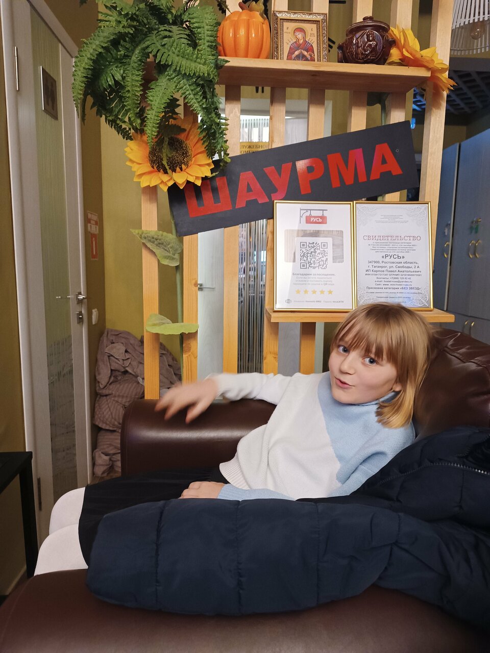 Прогуливая по приморскому парку проголодались и пошли в сторону магазинов. Увидели вывеску шаурмы и зашли в первую попавшуюся дверь, и оказались в очень прекрасном месте. Нас душевно встретили девочки, проконсультировали нас по всем интересующим нас вопросам. Мы заказали шаурму (которая оказалась очень веусной и сделанная с любовью) и на выходные забронировали баню. Всё очень чистенько, аккуратненько и душевно. Очень рада такому неожиданному повороту событий.