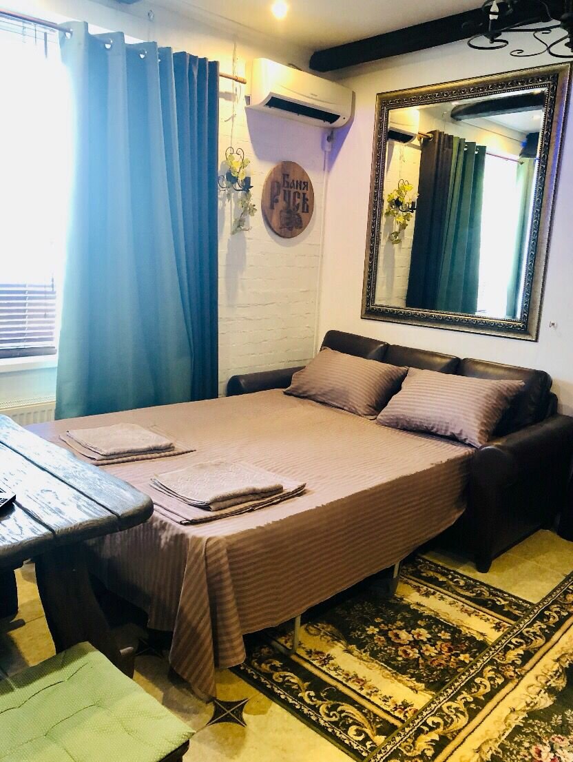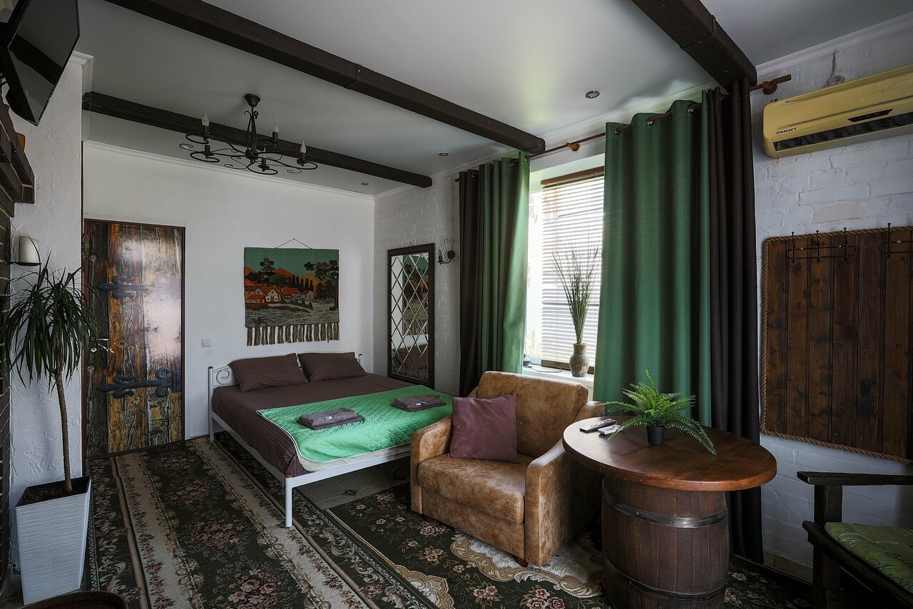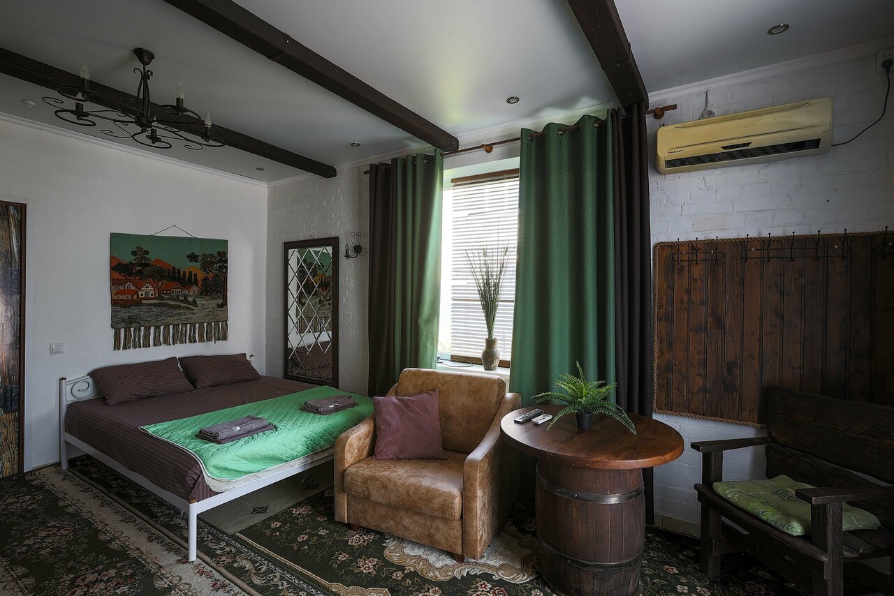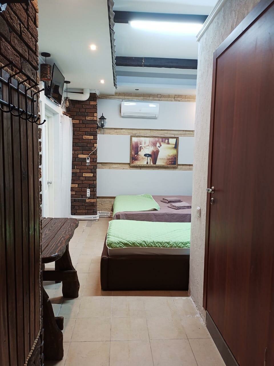 Отдельный номер с двуспальной и кресло кроватью.Оснащен: телевизор, холодильник, кондиционер, чайник, санузел с душем. В номере так же находится электрическая сауна. Выдается свежее постельное белье и полотенца.