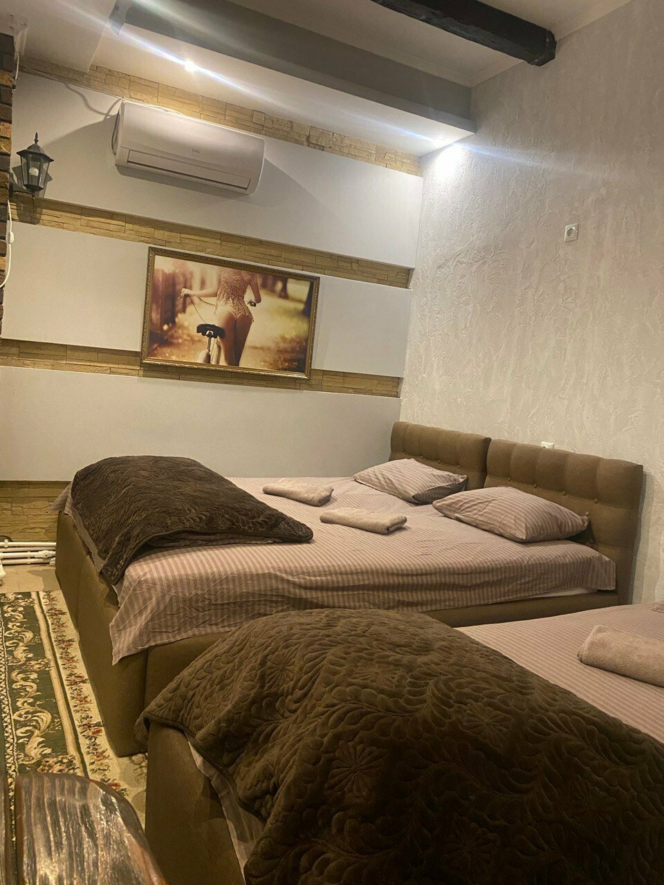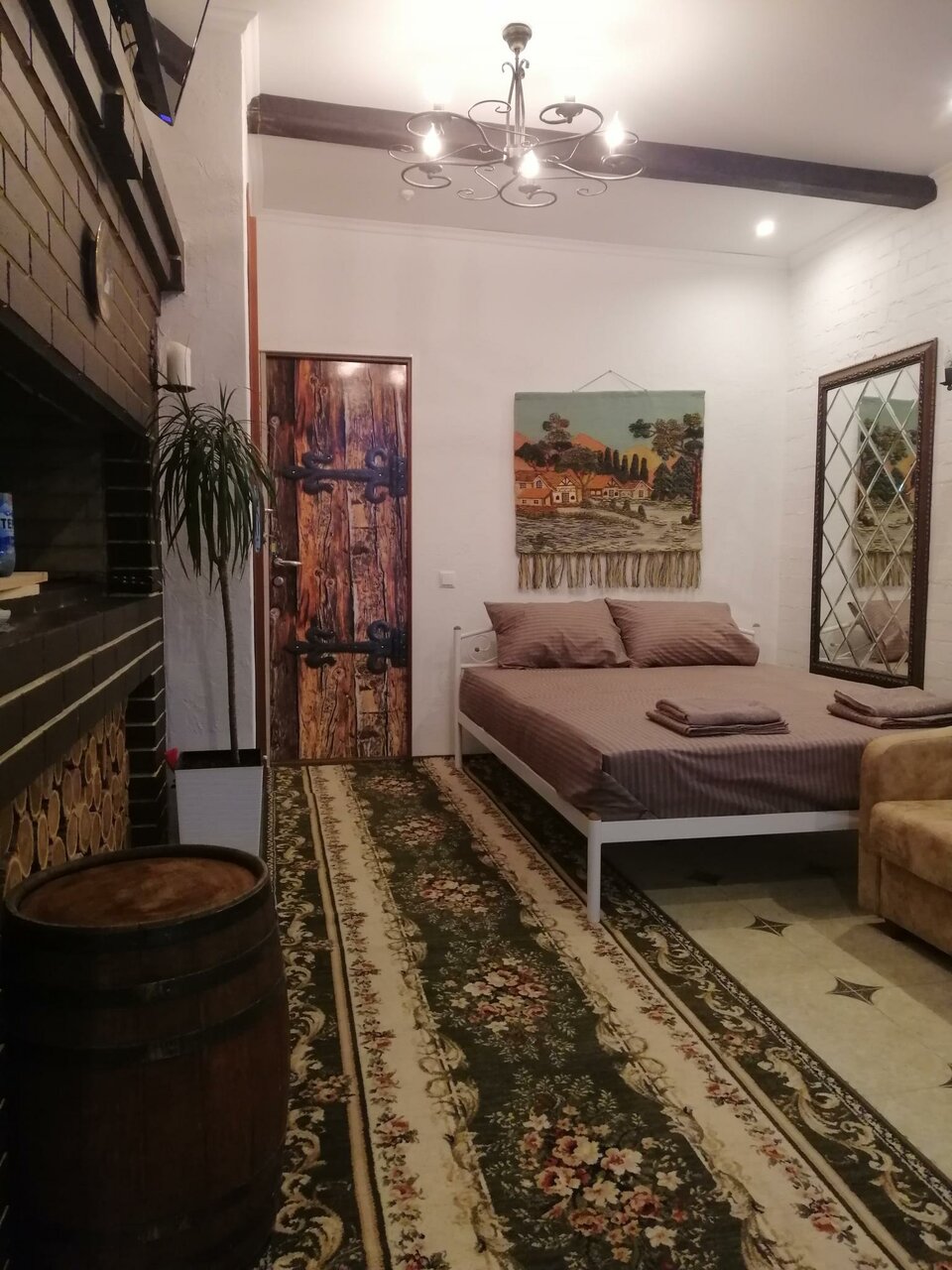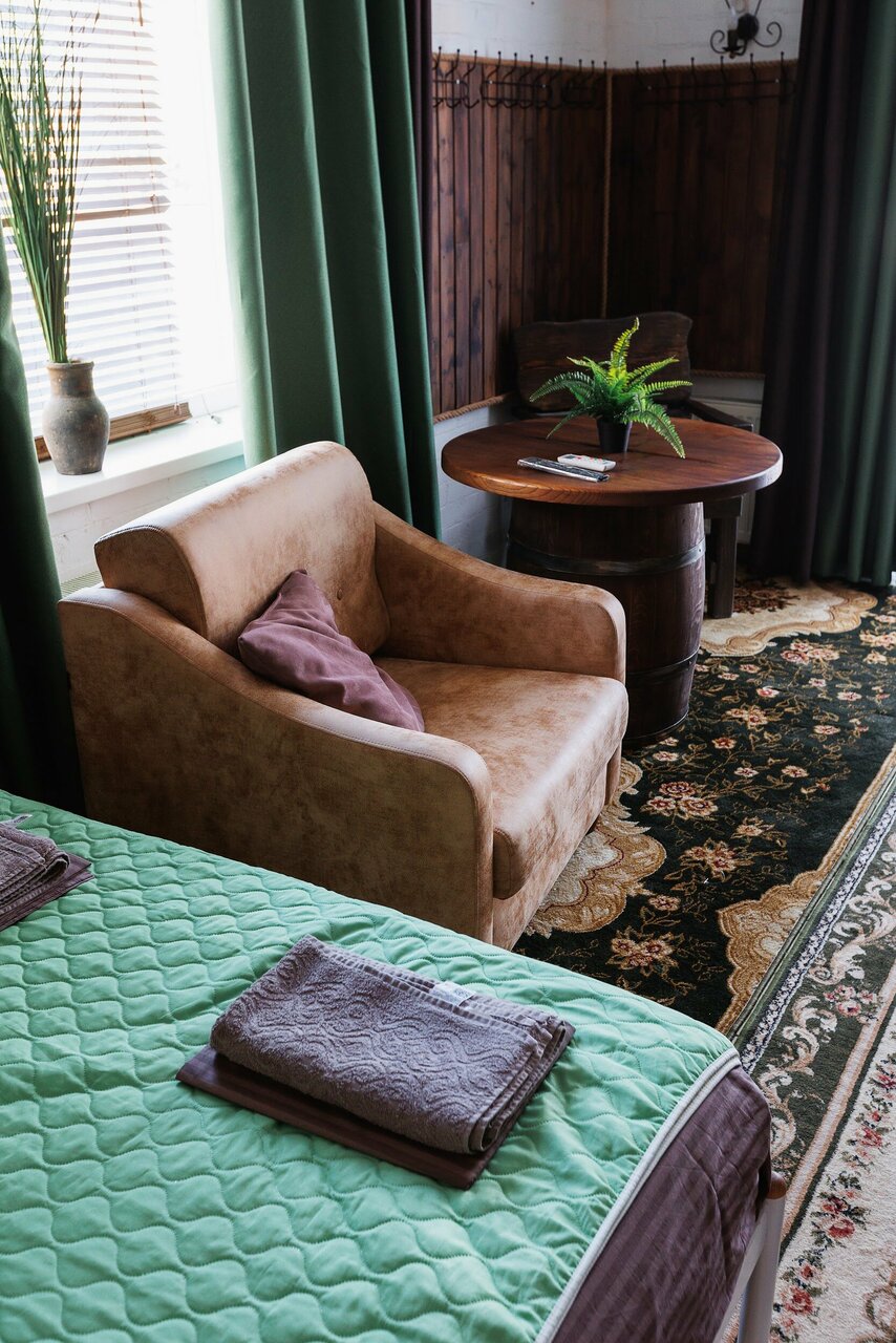 Отдельный номер с двуспальной и кресло кроватью.Оснащен: телевизор, холодильник, кондиционер, чайник, санузел с душем. В номере так же находится электрическая сауна. Выдается свежее постельное белье и полотенца.