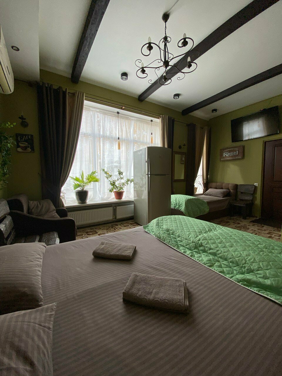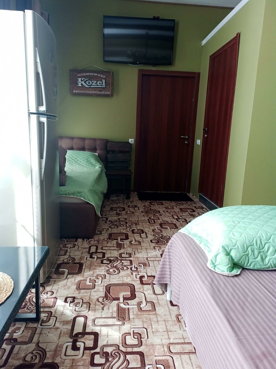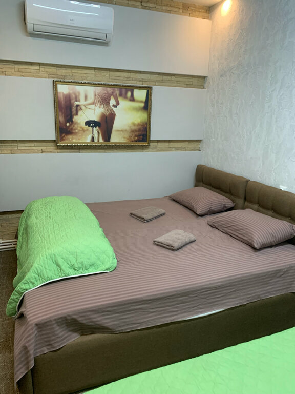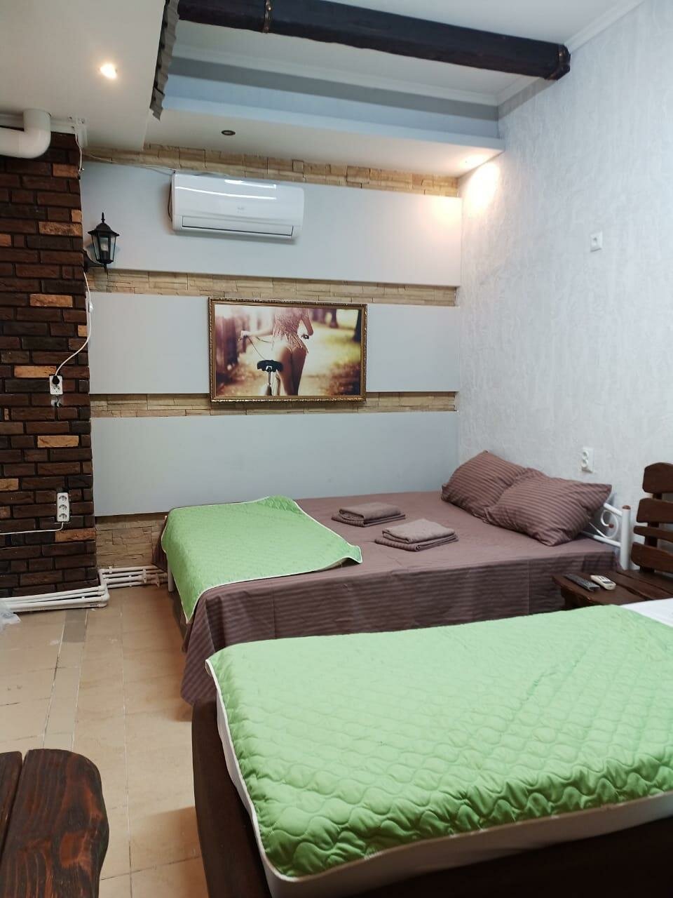 Отдельный номер с двуспальной, односпальной и кресло кроватью.Оснащен: телевизор, холодильник, чайник, кондиционер, санузел с душем, выдается свежее постельное белье и полотенца.
