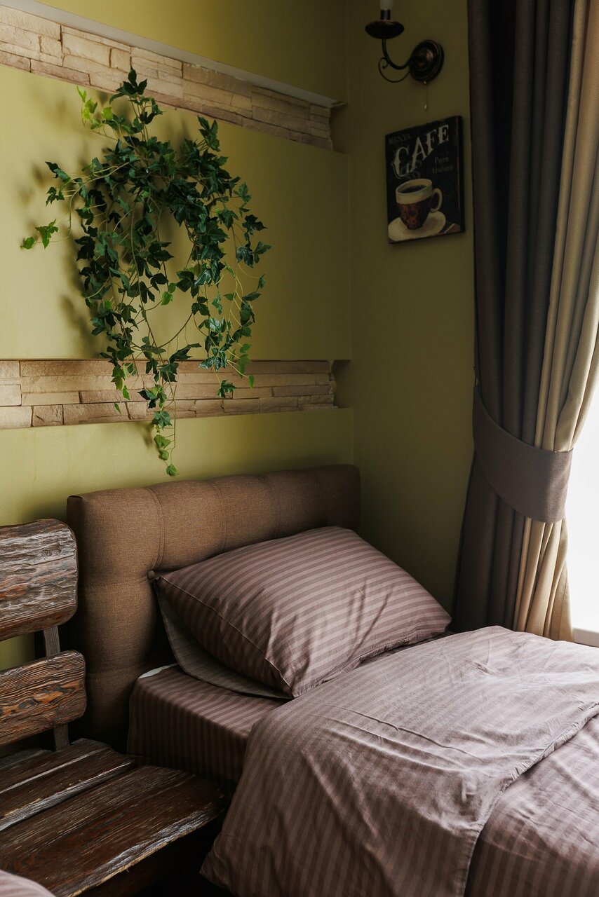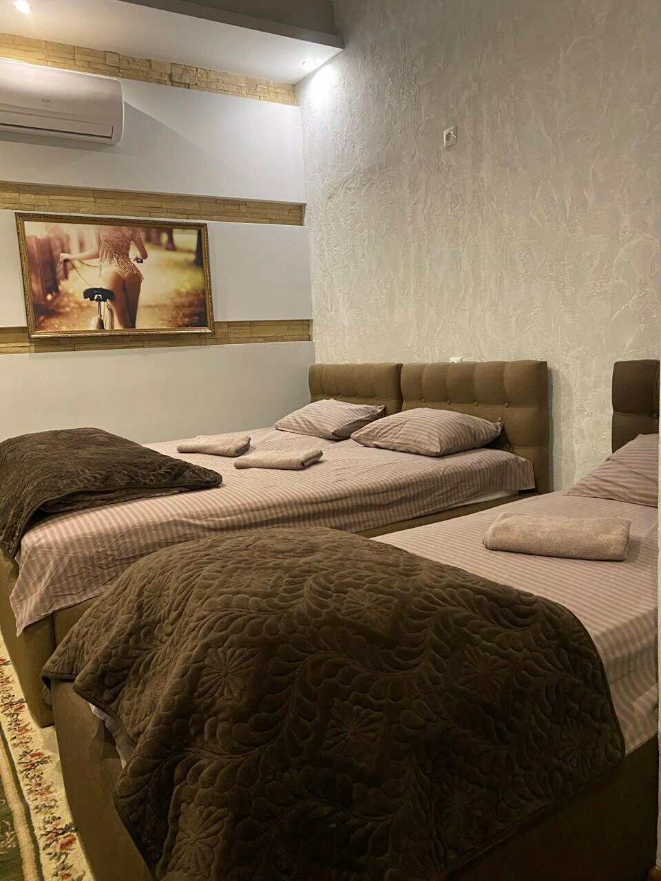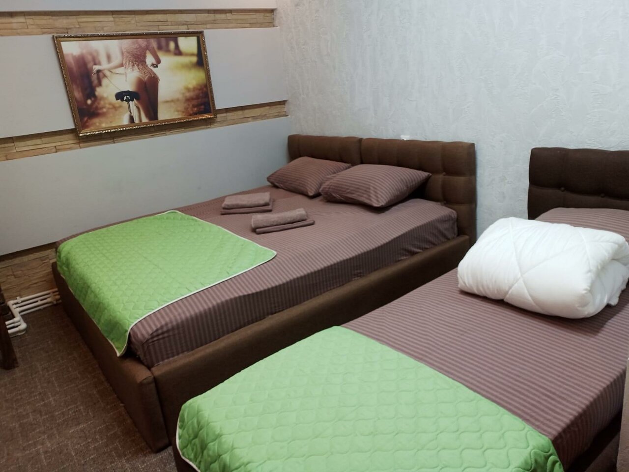 Отдельный номер с двуспальной, односпальной и кресло кроватью.Оснащен: телевизор, холодильник, чайник, кондиционер, санузел с душем, выдается свежее постельное белье и полотенца.