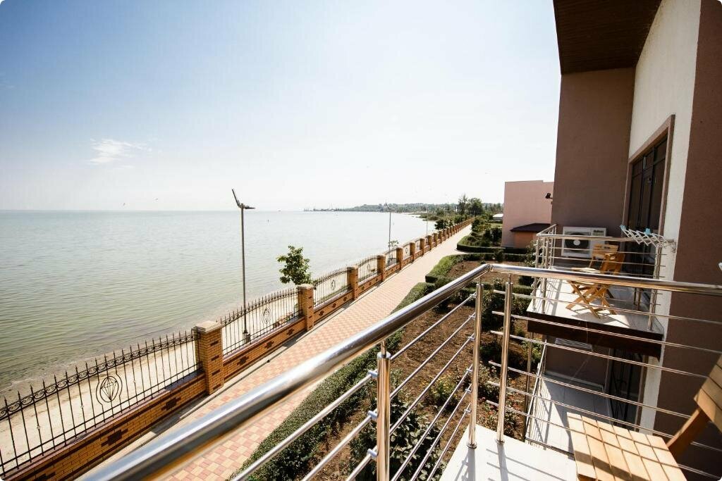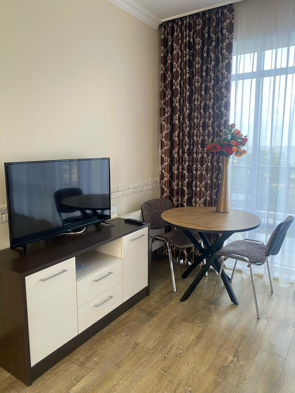 - Удобная кровать, хороший матрас.; Вид на море, близость к пляжу.; Возможность продлить утреннее пребывание.; Полная комплектация номеров (кухня, техника).; Красивый, удобный номер.