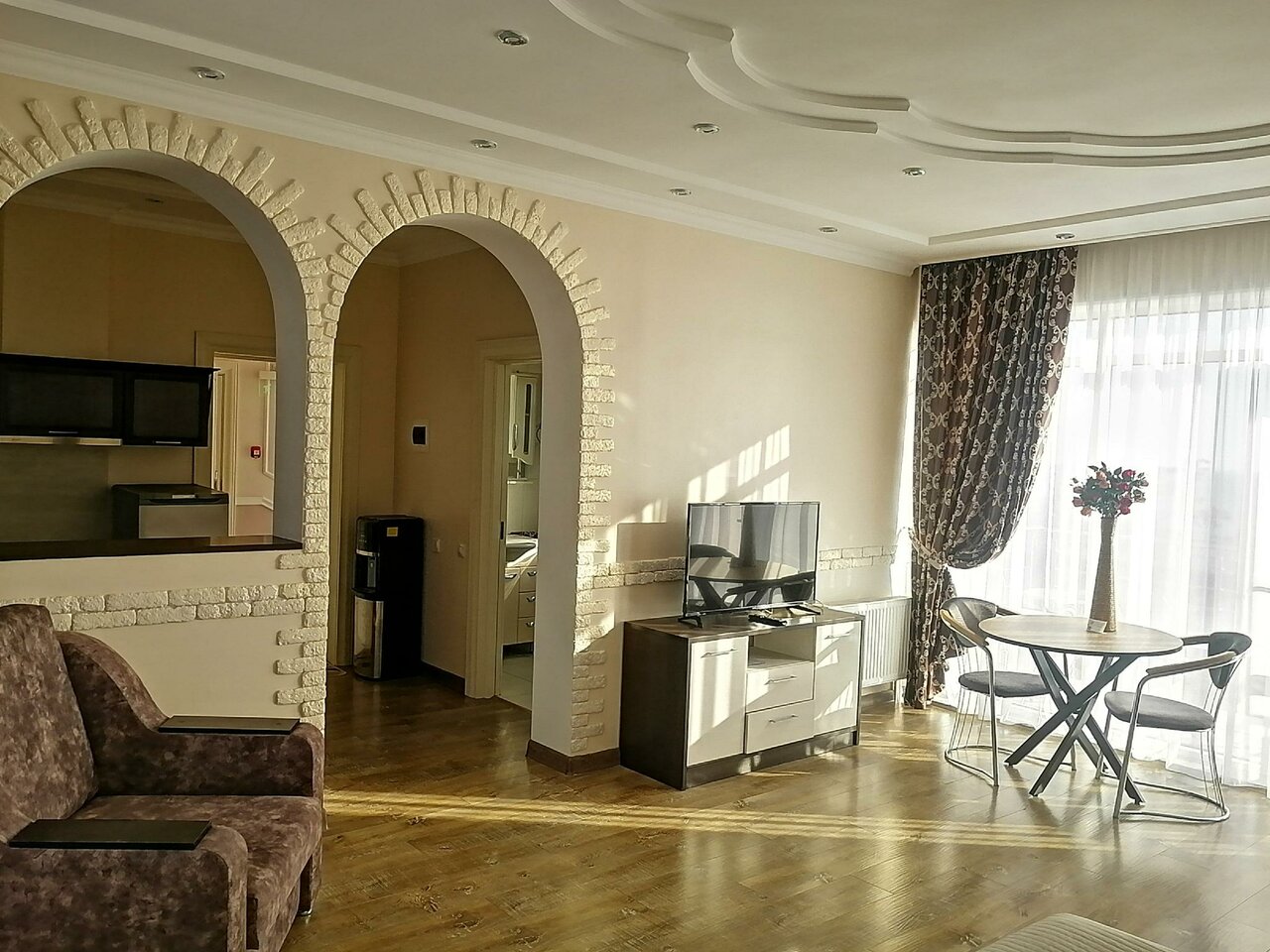 Двухкомнатные апартаменты: спальня, гостиная и ванная, балкон. В номерах есть: кондиционер, ЖК ТВ, холодильник, сейф, электроплита, микроволновая печь, электрочайник, фен, утюг, гладильная доска, кулер с водой, кухонные и столовые принадлежности