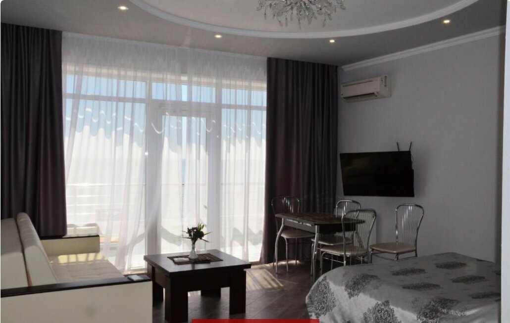 Однокомнатные апартаменты: гостиная, ванная, балкон. В номерах есть: кондиционер, ЖК ТВ, холодильник, сейф, электроплита, микроволновая печь, электрочайник, фен, утюг, гладильная доска, кулер с водой, кухонные и столовые принадлежности. На 1 линии.
