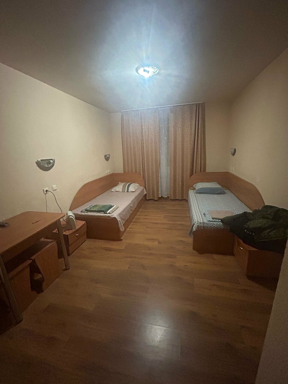 Не рекомендэйшн! Большой 2 комн номер. Back In The U.S.S.R. Со всеми вытекающими.. Но, на безрыбье — лучше чем в машине спать)) Заботливая рука хозяина закупила мебель и сделала ремонт где-то в период правления Рюриковичей. Матрац на кровати садистски впивается пружинами в ягодицы.Кухонная зона есть — посуду забрали Рюриковичи)) С/у — со своей загадкой. Холодос в коридоре (как победа — один на всех) Кондёр тарахтит как Запорожец,напоминая о величии Советского Союза. Вообще отличное место,чтобы сбить столичный лоск с прогрессивного пассажира)) По мне же — как с роднёй повидался))