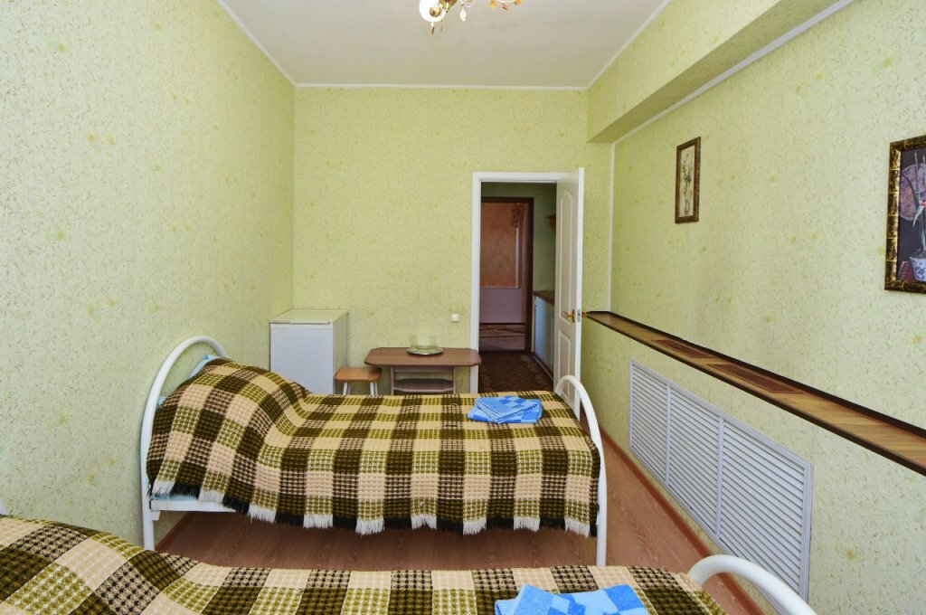 Номер — три кровати, тумбочка. Телевизор не работает. К утру в санузле стоял запах канализации. Не критично для одной ночи.