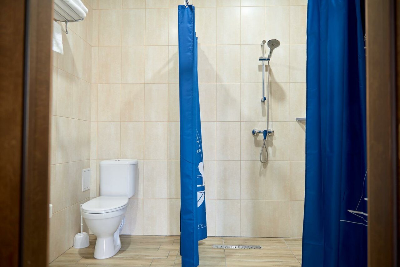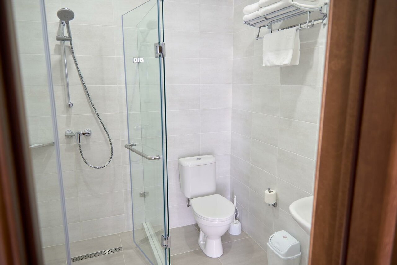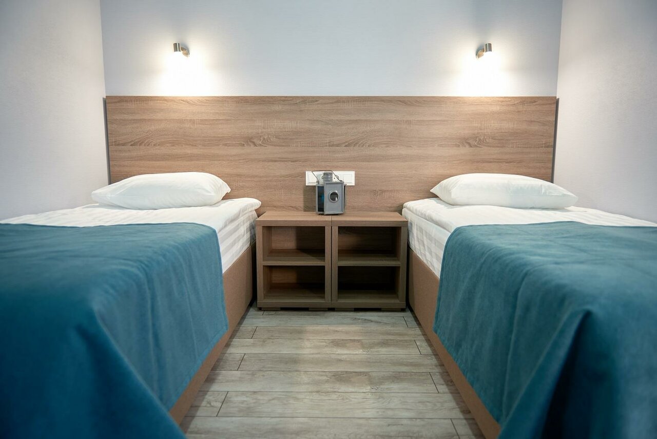 В этот раз остановились в номере с двумя раздельными кроватями и санузлом в номере. Есть телевизор, небольшой холодильник, столовые приборы, стаканы, тарелки. Хороший вай-фай. Вообщем все условия для того чтобы отдохнуть. В коридоре есть кулер с горячей и холодной водой, на случай если вы не хотите воспользоваться общей кухней. На кухне можно разогреть готовую пищу или что-то приготовить, попить чай. Так при гостинице имеется большая парковка. Останавливались тут второй раз. Нас все устраивает.