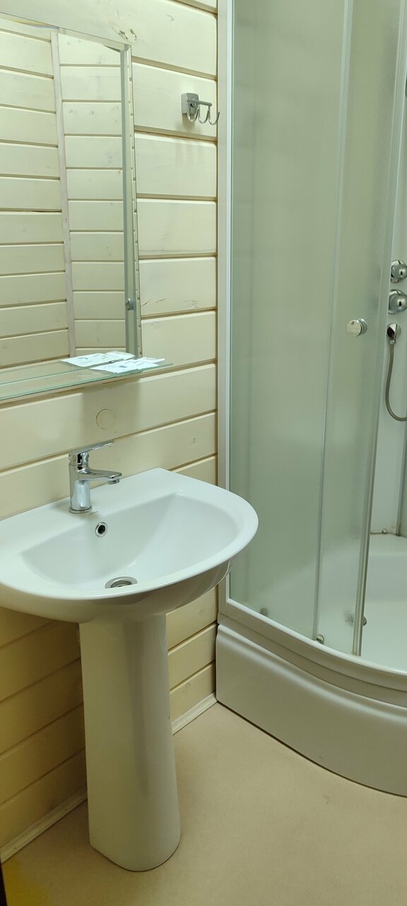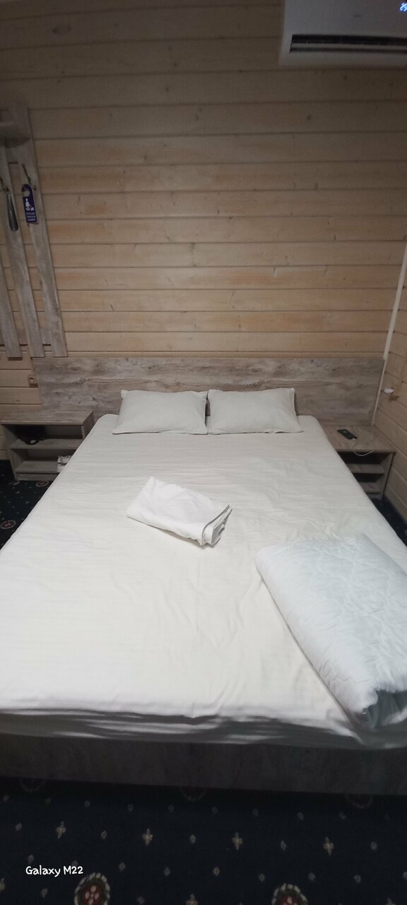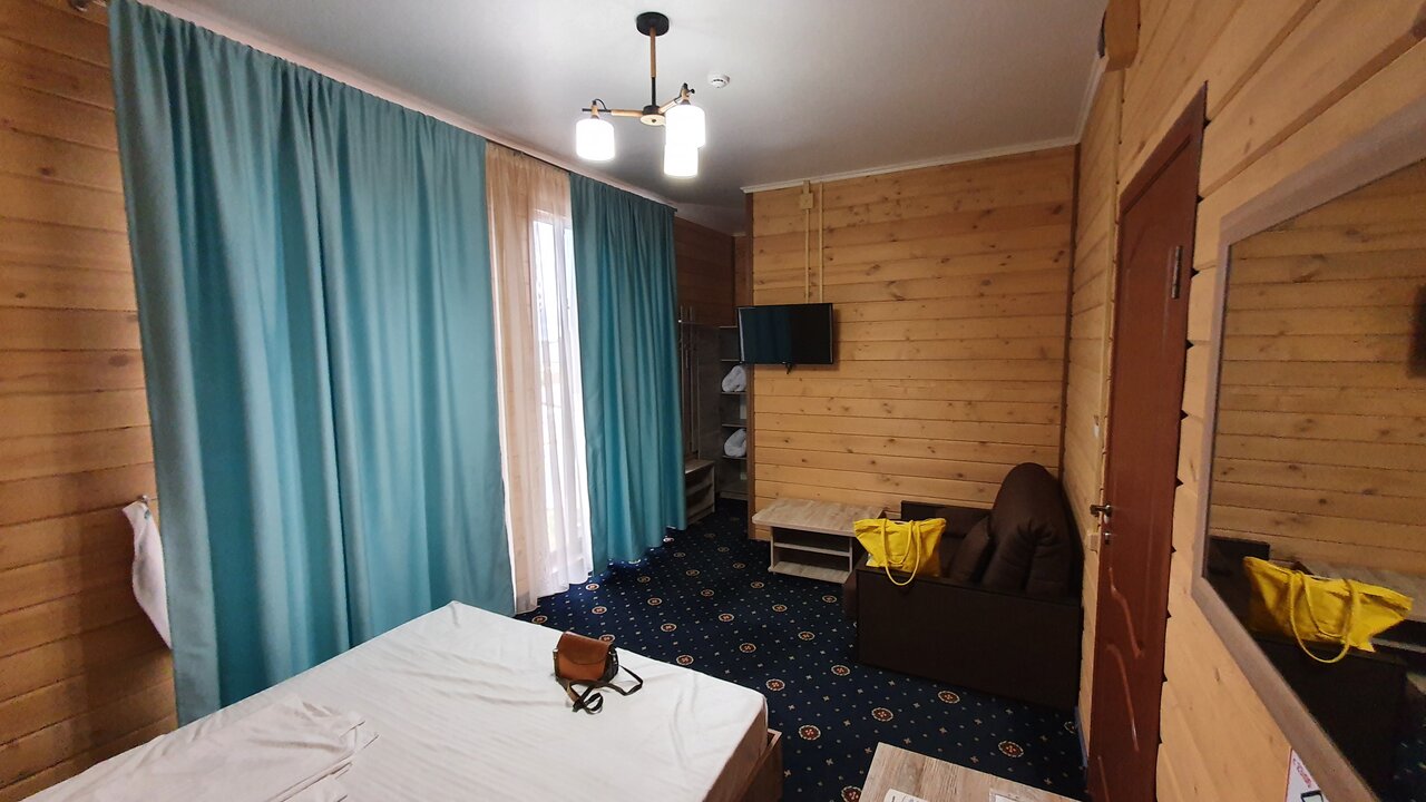 Это наш любимый отель. Если едем в те края, то подгадываем, чтоб остановиться в нем. Он весь такой деревяненький, просто теремок. Очень нравится и все необходимое есть. Кровать очень удобная, хорошее белье. Есть маленький мягкий диванчик. Замечательные шторы. Большие форточки, но есть и кондиционер. Душевая кабина, холодильник. За символическую плату можно покушать хоть и простенький, но домашней и горячей пищи. Даже ягодки с огорода бывают. Реально отдыхаешь за те часы, которые там находишься. Отель чуть~чуть в стороне от трассы, не слышно надоевшего за день шуршания шин и это классно. Сделано для людей, спасибо!