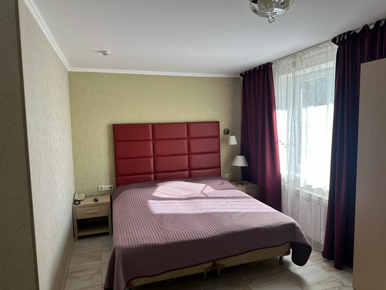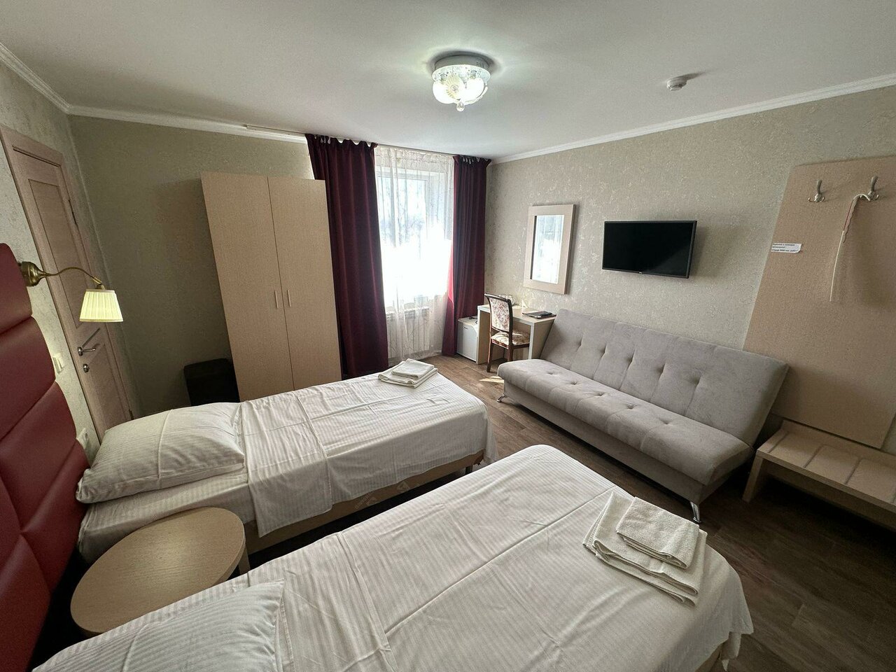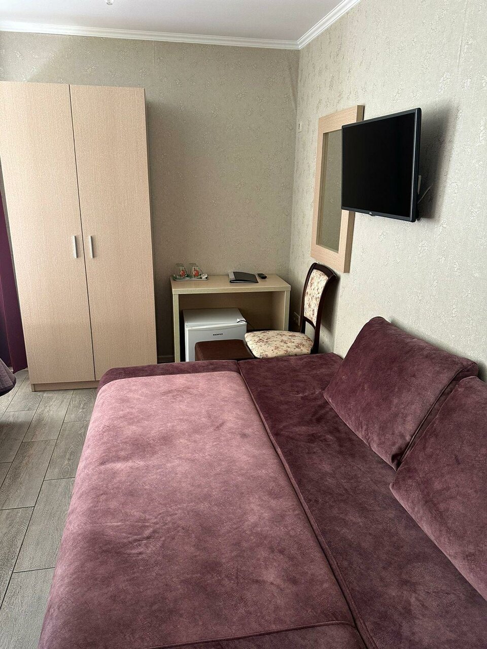 Стоимость номера от 2300 руб. за 1-2 человек. За ребенка доплата 300 руб., за взрослого доплата 500 руб. В номере есть кондиционер, санузел, двухспальная кровать и диван. В услуги входят полотенца, уборка номера, смена постельного белья в н...