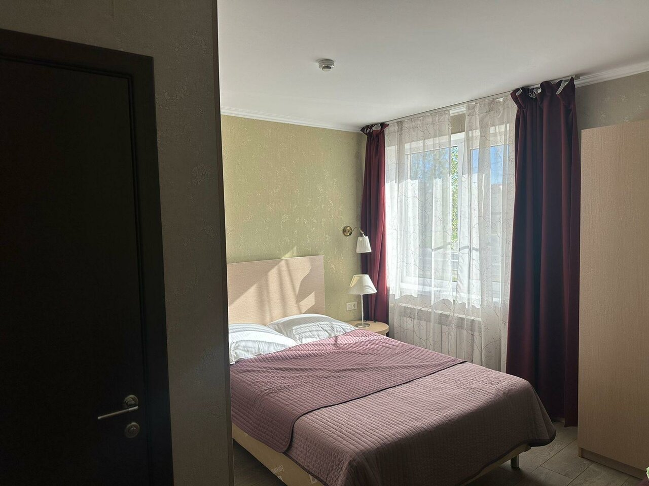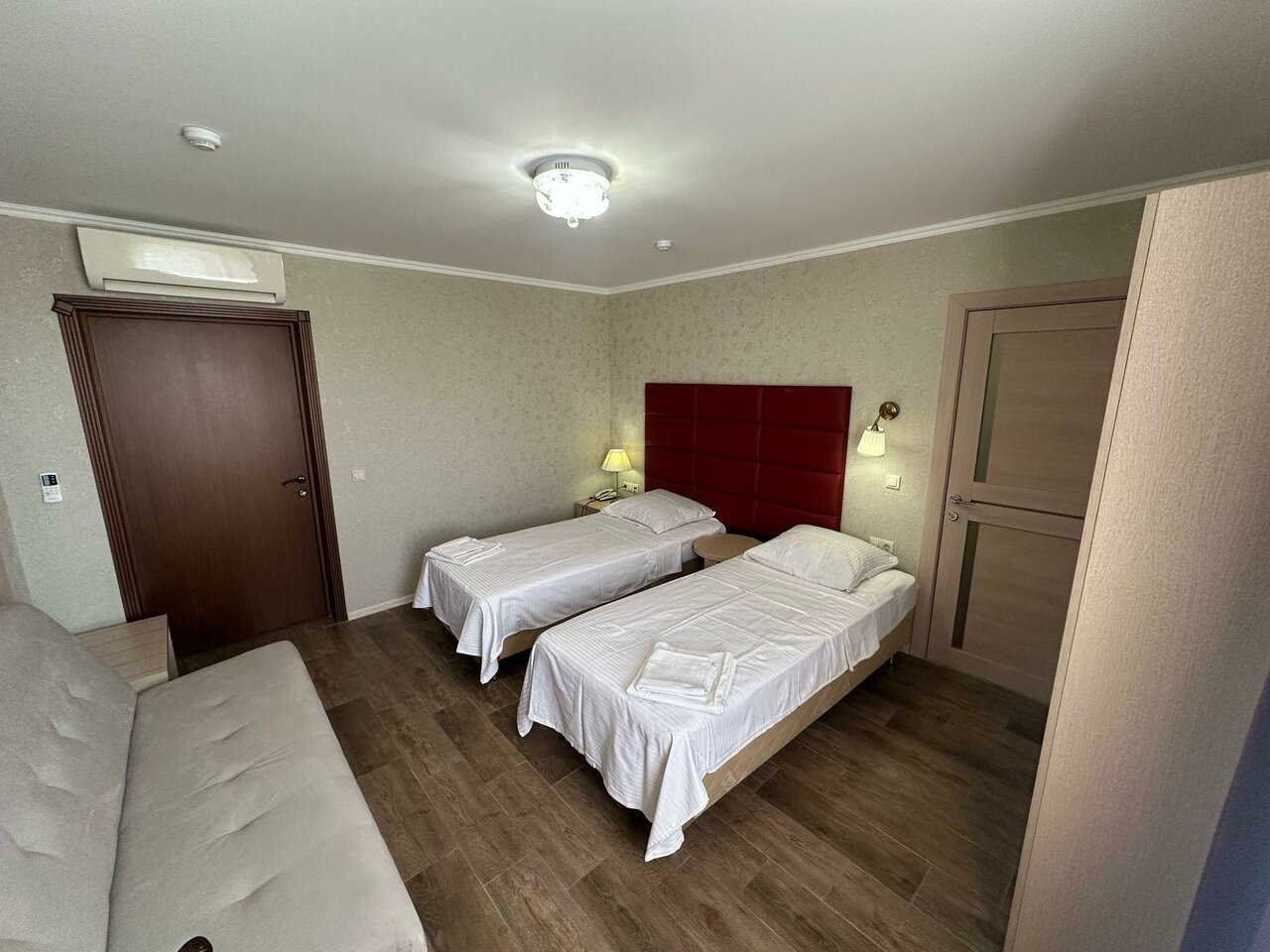 Стоимость номера за 1-2 человек - 2200 руб. За ребенка доплата 300 руб., за взрослого доплата 500 руб. В номере есть кондиционер, санузел, двухспальная кровать и диван. В услуги входят полотенца, уборка номера, смена постельного белья в наз...