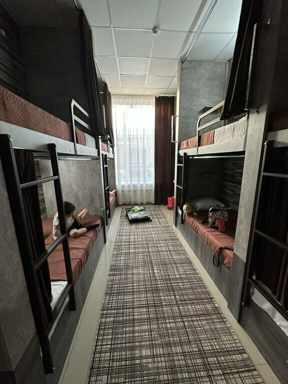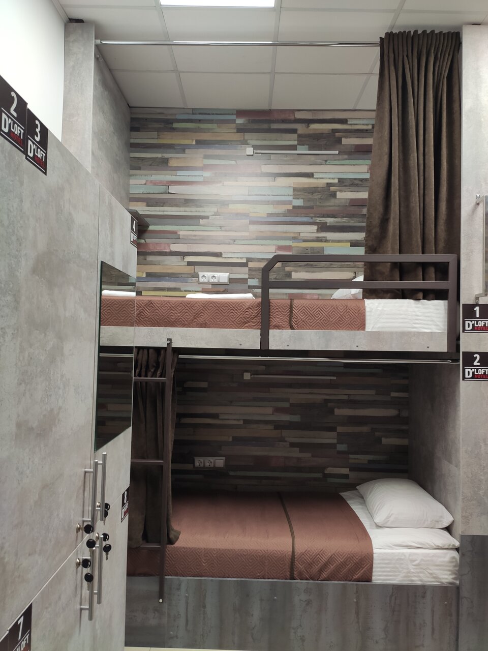 Однокомнатный комфортабельный 4-х местный номер. Индивидуальное одноместное пространство 110/200 для каждого гостя, отгороженное black out шторой, с ортопедическим матрасом, LED светильником и розетками 220V. Индивидуальная полочка, крючки.