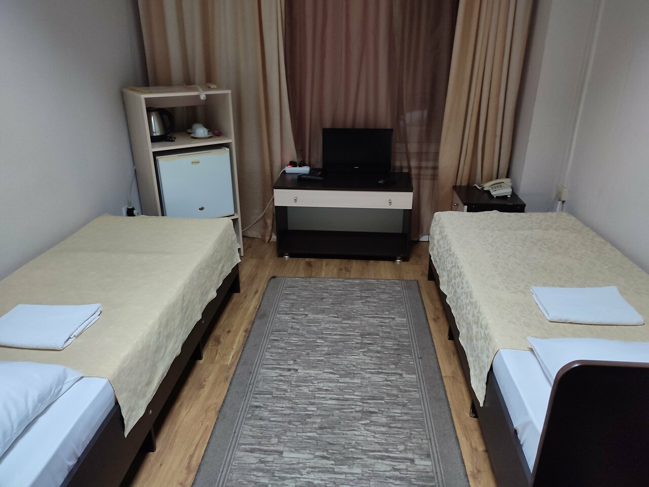 Уверенные 3 звезды. На ночь пойдет. Есть телевизор холодильник душ туалет. При желании питание. Что еще нужно туристам едущим на юг. Персонал немного ленивый.